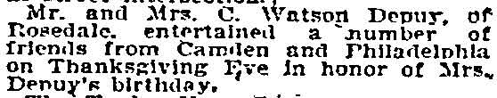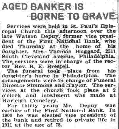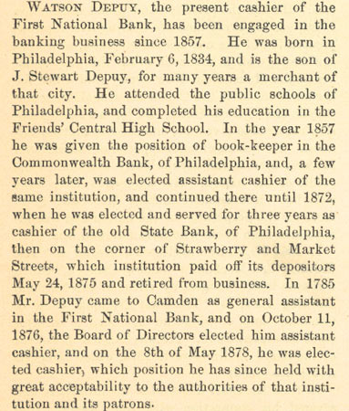 WATSON DEPUY was born February 6, 1934 in Philadelphia, Pennsylvania. He married Elizabeth Eliza Harman in the early 1850s, and began working in the banking business in 1857. Watson Depuy came to Camden in 1875 to work at the First National Bank. In 1878 he was promoted to head cashier of this bank, a post he held for thirty years. In 1908 he was elected vice-president of the bank. The 1880 Census shows Watson Depuy and family living at 531 North 6th Street. The 1880 City Directory has the family at 315 Cooper Street. According to the directories for 1884 and 1885, the Depuys resided at 519 Linden Street, By 1887 Watson Depuy and family were making their home at 511 Linden Street. This would be his home until his retirement in 1911. Watson Depuy passed away in Philadelphia at the home of his daughter, Clara Depuy Huggard, on May 20, 1915. After services at St. Paul's Episcopal Church in Camden, he was buried at Harleigh Cemetery. |