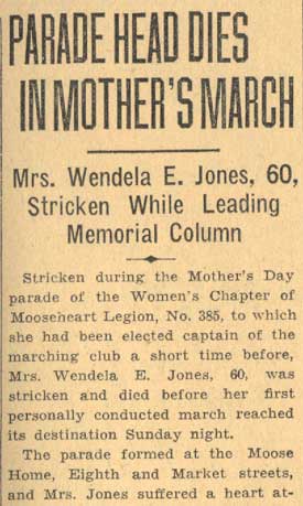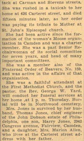 WENDELA E. JONES was born in Sweden around 1873. Her family came to America in 1879. She married Thomas Jones around 1891. The Jones family lived 403 South 5th Street at the time of the 1920 census. 1930 found them living in Woodlynne, but they moved back to Camden soon after, to 426 Carteret Street, where she was living in 1934. Mrs. Jones was a charter member of the women's Moose organization in Camden, the Women's Chapter of Mooseheart Legion No. 385. She was an officer in that organization, and chaired at different times many of its committees. Wendela Jones had been elected to lead the Mooseheart Legion's Mothers Day Parade on May 13, 1934. The parade originated at the Moose Lodge at 8th & Market Streets. While leading the parade, she suffered a heart attack at Carman. Taken in a taxicab to her home at 426 Carteret Street, she died fifteen minutes after her reaching home. Wendela Jones was survived by her husband, son Harry, and daughter Mrs. Marion Allen. |