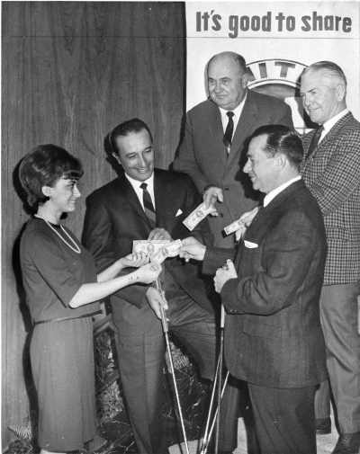 Contribute Money "Camden County's United Fund drive became $400 richer as each of four golfers contributed $100 to play in tomorrow's tournament for the benefit of the campaign. Miss United Fund of 1965, Amelia Romano, of Collingswood, accepts $100 bills offered by (from left) Joseph Forte, Berlin, head of the Lower Camden County towns phase pf the drive; Chief Wilfred Dube, former Camden County detective; Joseph Stagliano, of the Formigli Corp., and horse trainer Ray Metcalf." |