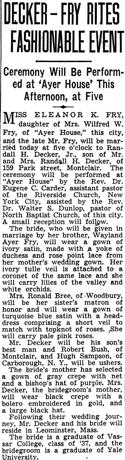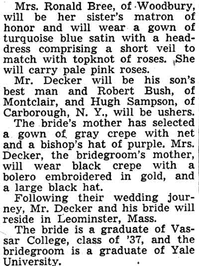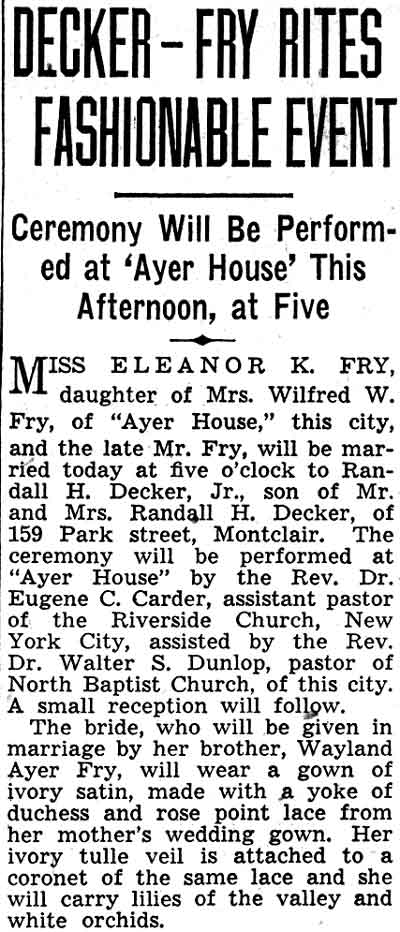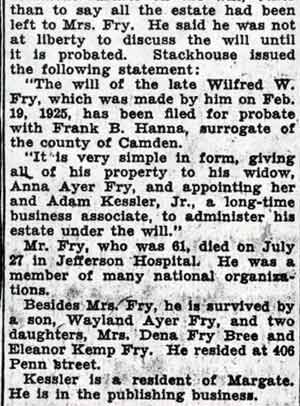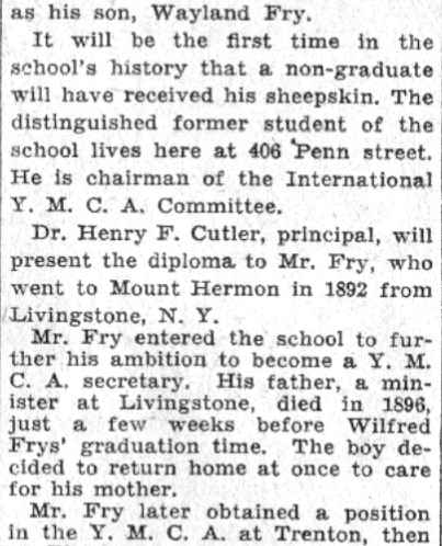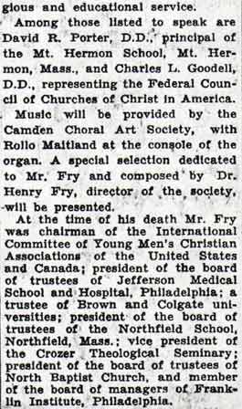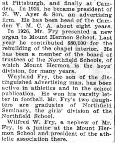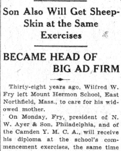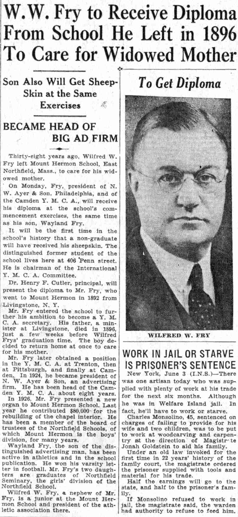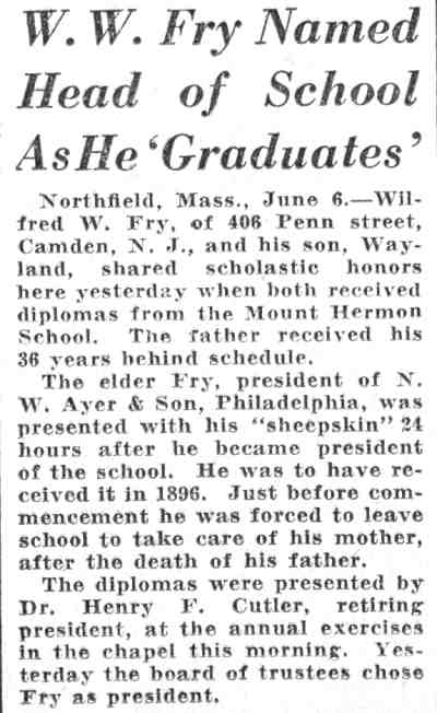 The younger set is occupied with homecomings these days with the college men and women and the boarding school students returning to the fold. Mrs. William T. Haddon will return early this week to her home, 336 Hinchman Avenue, Haddonfield, with her daughter, Miss Aileen Elizabeth Haddon, who is a student at Bradford Junior College, Boston, Massachusetts. Mrs. Haddon made the trip by motor and was accompanied by her son, William K. Haddon, II, and Everett A. Tyler, son of Mr. and Mrs. Everett A. Tyler, also of Haddonfield. Leon F. Rittenhouse of 1557 Bradley Avenue, is leaving today for California, where he will continue his study of medicine. Mr. Rittenhouse was a graduate from Washington Missionary College, in the national capital on Monday. Two of the Wilfred W. Frys' children were graduated at schools in New York and Massachusetts, this past weekend and today. Tonight Miss Eleanor Fry will be graduated from the Emma Willard School at Troy, New York Last week Wilfred W. Fry, II, was graduated from Mt. Hermon School, Mt. Hermon, Massachusetts. Henry J. Bowes Jr., son of Mr. and Mrs. Henry J. Bowes of Merchantville, spent last week in Annapolis, Maryland, where he took entrance examinations for the United States Naval Academy. He was graduated last week from Valley Forge Military Academy, Valley Forge, Pennsylvania. Miss Helen Pratt, daughter of Mr. and Mrs. Byron Pratt of 213 North Fourth Street, has returned from Bucknell University for the Summer. Miss Betty McCausland, daughter of Mr. and Mrs. William McCausland of Salem, was graduated at the Birmingham School, Birmingham, Pennsylvania last week. Mrs. McCausland, with her daughter, Miss Frances McCausland attended the Commencement exercises as did Miss Elsie McCausland, who is a student at the school. Miss Eleanor Holman of 108 North Fourth Street and Miss Betty Dickinson of 931 Cooper Street, have returned to their respective homes for the Summer. They are attending Syracuse University. Miss Frances Snyder of 331 North Forty-first street, was graduated at Syracuse this month. |
