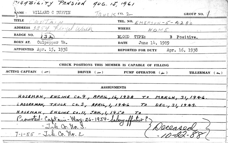 WILLARD C. DUFFIN was born on June 15, 1909 in Culpepper, Virginia to Jeremiah and Emma Duffin. His father was a blacksmith by trade and apparently brought Willard and his mother to Camden during World War I, as he was employed at one of Camden's shipyards in January of 1920 when the Census was enumerated. The Duffins were then living in a boardinghouse at 576 Mickle Street operated by a Mary Jones. The family appears to have remained in the area, but the do not appear in Camden City Directories in 1924, 1927, or 1929. At some point in the latter half of the 1920s, Willard C. Duffin enlisted in the United States Navy. When the Census was taken in April of 1930, Willard C. Duffin was serving with the rank of Seaman First Class, assigned to the USS Mahan. The USS Mahan, originally designated DD-102, was a Wickes -class destroyer in the United States Navy during World War I and later designated, DM-7, in the years following. She was named in honor of Rear Admiral Alfred Thayer Mahan. Mahan was laid down on May 4, 1918 by the Fore River Shipyard, Quincy, Massachusetts; launched August 4, 1918; sponsored by Miss Ellen K. Mahan, niece of Rear Admiral Mahan; and commissioned October 24, 1918, Lieutenant Commander F. P. Conger in command. After shakedown, Mahan operated off Cuba until May 1919 when she steamed to the Azores to become one of the guide ships for the transatlantic flights of Navy flying boats NC-1, NC-3, and NC-4. Returning to Boston by way of Brest, France, on June 21, Mahan was converted to a light minelayer and was redesignated DM-7, July 17, 1920. With the exception of a cruise to Pearl Harbor for maneuvers early in 1925, Mahan operated along the east coast, in the Caribbean and off the Panama Canal Zone for the next 10 years, During this time she participated in fleet training exercises; patrolled courses for international races; e.g., the International Six Meter Sailing Races of 1922 and 1927; assisted in salvage operations for submarines S-51 (September 1925, off Block Island and S-4 (periodically from December 17, 1927 through mid-March 1928, off Provincetown, Massachusetts); and conducted reserve training cruises in the Caribbean, 1928 to September 1929. Throughout the decade, in addition to her regular duties, she served as an experimental ship, testing new equipment for the Navy's future use. On September 20, 1929, she entered Philadelphia Navy Yard, where she decommissioned May 1, 1930. Struck from the Navy Register October 22, she was sold for scrap January 17, 1931 to the Boston Iron & Metal Company of Baltimore, Maryland. After completing his term of service with the United States Navy, Willard C. Duffin returned to Camden, New Jersey. Willard C. Duffin was appointed to the Camden Fire Department on April 15, 1938. Assigned to Engine Company 9 at North 27th Street and Federal Street in East Camden, he reported for duty the next day. He served with Engine Company 9 until March 31, 1946 when he was given duty with Ladder Company 3, quartered in the same building. Willard C. Duffin remained at the East Camden firehouse until December 31, 1949. The 1947 Camden City Directory shows Willard C. and Margaret Duffin living at 25 Terrace Avenue in East Camden, and the family was still at that location in the fall of 1956. On January 1, 1950 Willard C. Duffin began a term of service with Engine Company 11 on North 27th Street in Cramer Hill. He was promoted to Captain on May 26, 1954 and returned to Ladder Company 3. July 1, 1955 saw another transfer, when Captain Duffin was sent to Ladder Company 2 in South Camden. He finished his career with this unit, retiring on a disability pension on August 1, 1961. During the mid-1950s the Duffin family became involved in a business known as American Welding Services, based at 2640 Harrison Avenue in Cramer Hill. This business however, was gone by the fall of 1959, as it is not listed in that year's New Jersey Bell Telephone Directory. Willard C. Duffin had moved to 3254 Floyd Walk in Fairview by the fall on 1959. He later moved to Bellmawr, New Jersey. He passed away on October 22, 1988. |