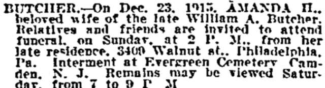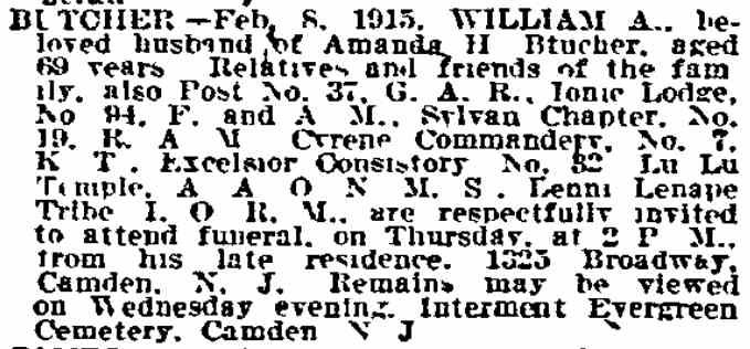 WILLIAM A. BUTCHER was born aroun 1844 in Pennsylvania. He was the son of a shoemaker, Samuel C. Butcher and his wife Jane. The family, which included older sister Elizabeth, older brothers Samuel and Joseph, and a younger brother, Francis, had moved to South Jersey and was living in Woolwich Township when the census was taken in 1850. The Butcher family, had moved to South Camden by the time the Census was taken in 1860. Sadly, Francis had passed away. William A. Butcher followed his father and older brothers into the shoe trade. The Samuel Butcher family appears in City Directories at 509 Walnut Street from 1863 through 1869, maintaining a presence in the 500 block of Walnut Street for a few yeas thereafter. William A. Butcher was enlisted as a Private into Company F, 4th New Jersey Infantry on February 5, 1864. He mustered out on July 9, 1865. When he joined the 4th New Jersey it was encamped for the winter at Brandy Station. Going into action in May, the 4th New Jersey took part in the Battles of the Wilderness from May 5 to May 7, Spotsylvania from May 8 to Mat 12, and at Spotsylvania Courthouse from May 12 to May 21, engaging in the assault on the Salient, the "Bloody Angle". From May 23 to May 26 the 4th New Jersey was at the North Anna River, and was on line of the Pamunkey from May 26 to May 28. The regiment finished the month at Totoptomoy. June of 1864 saw the 4th New Jersey engaged at Cold Harbor, Petersburg, and on the Jerusalem Plank Road. The regiment was shifted to Washington, D.C.. On July 11 and 12, the 4th New Jersey was among the units that repulsed of Confederate General Early's attack on Fort Stevens and the Northern Defenses of Washington, and took part in the pursuit of Early to Snicker's Gap in mid-July. After a rest and refit, the 5th New Jersey was part of General Sheridan's command during the Shenandoah Valley Campaign, which last from August 7 well into November, engaging at Strasburg, Cedar Creek, Winchester, Charlestown, again at Winchester on September 19, and at Fisher's Hill afterwards. On October 19, the 4th New Jersey was on hand for the Battle of Cedar Creek. The regiment continued to serve in the Shenandoah Valley into December, before moving to Washington, D.C., then to Petersburg, Va. and Siege of Petersburg. While on leave, William A. Butcher married Amanda Hatfield at Tabernacle Methodist Episcopal Church on February 8, 1865. Going back into service in 1865, the 4th New Jersey Infantry took part in the Appomattox Campaign, and was at Petersburg when it fell on April 2. The next seven days were spent in pursuit of General Lee and his Confederate Army, which surrendered on April 9 at Appomattox Court House. Surrender of Lee and his army. With