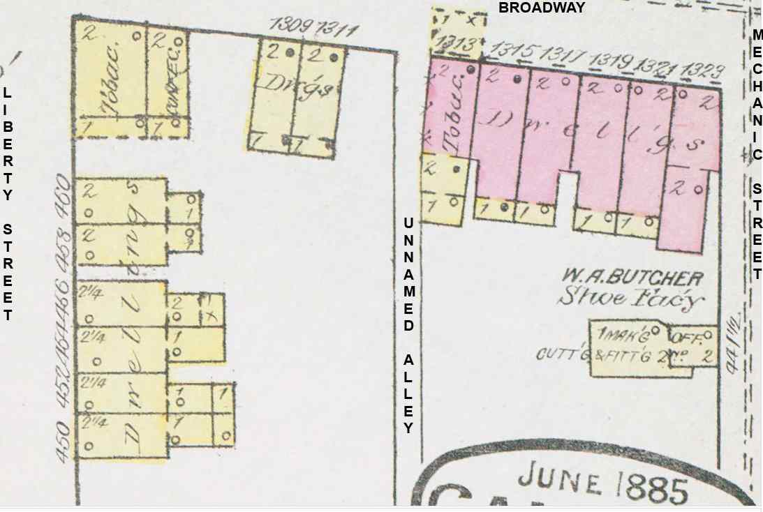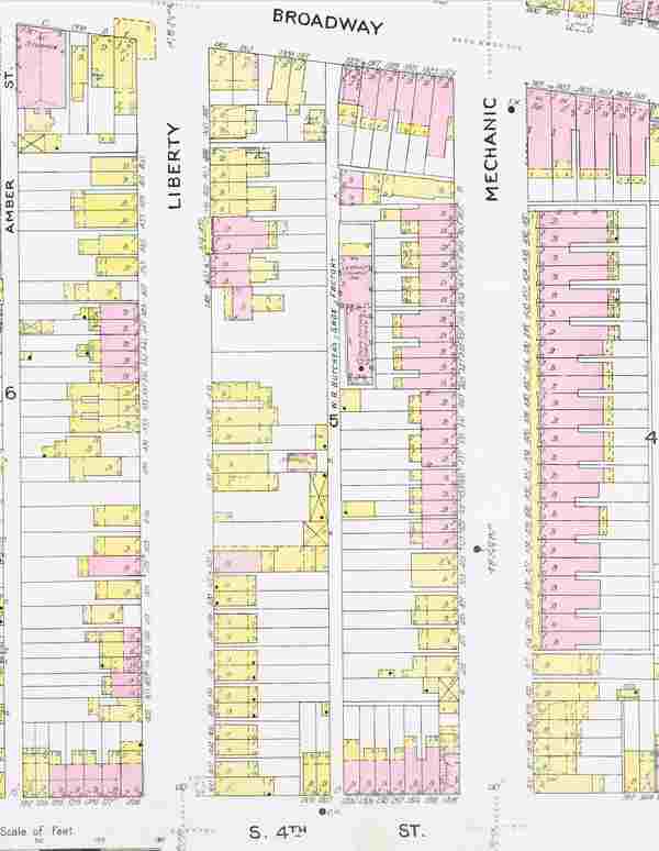 out on May 18. The 4th New Jersey then went to Washington D.C. On The 4th New Jersey took part in the June 8, 1865 Corps Review, then mustered out at Hall's Hill, Virginia under Colonel Campbell. Private Butcher then returned to Camden. The 1869 Directory reveals that William Butcher was living at 508 William Street. The following year's directory has him at 512 Walnut Street. 1872's Directory has William A. Butcher at 1117 Broadway. The 1876 City Directory lists William A. Butcher at 1242 South 4th Street. His parents, sister Elizabeth and brother Joseph lived across the street at 1239 South 4th Street, along with a nephew and a niece. The 1877 Directory shows him at 482 Liberty Street. In that year William A. Butcher established a shoe manufacturing business. The 1878 City Directory shows a residential address of 1323 Broadway. The 1879 Director Shows that he had moved to 1319 Broadway. The 1880 Census shows William Butcher, his wife Amanda and 12 year-old daughter Amanda living at 1319 Broadway, as does the 1881 Directory. The 1883 Directory indicates that William A. Butcher was using 1325 Broadway as a shoe factory and 1323 Broadway as a residence, while the 1885 Directory indicates that 1325 Broadway was used both as a shoe factory and as a residence. City Directories from 1887 through 1891 show home at 1325 Broadway, and give a street address of 451 Mechanic Street for the shoe factory. The 1891 Sanborn Map gives an address of 459 Mechanic Street, and does not show the buildings that were later erected on Butcher's Alley, which ran east from Broadway between Liberty and Mechanic Streets. A large two-story building used for leather storage, shoe fitting, and shoe storage was built on the south side of the alley, on a parcel of land behind 443 to 465 Mechanic Street. A small frame building was built on the north side of the alley, behind 466 & 468 Liberty Street. Two small dwelling were built at the rear of the factory, which later carried the addresses of 465 and 467 Butcher's Alley. The 1894 Directory and subsequent editions show the factory at 467 Mechanic Street. It appears that street numbers were revised in the 400 block of Mechanic Street when rows homes were built there in the 1890s. The 1906 Sanborn Map shows 467 Mechanic Street as a dwelling. The continued use of 467 Mechanic Street as an address seems to indicate a mixed use, however. William A. Butcher's shoe factory employed 40 people in 1901, according to the Industrial Directory of New Jersey, published that year. William A. Butcher died at his home, 1325 Broadway, on February 8, 1915 and was buried at Evergreen Cemetery in Camden. His wife, Amanda Hatfield Butcher, died in Philadelphia on December 23, 1915 and rests next to her husband. William A. Butcher was a member of the William B. Hatch Post No. 37 of the G.A.R.; the Lenni Lenape Tribe of the Improved Order of Red Men; Ionic Lodge No. 94, Free & Accepted Masons; and other fraternal organizations. By 1961 all of William A. Butcher's buildings were gone except for the two dwellings on Butcher's Alley. In the early 1990s the City of Camden built their new firehouse, Liberty Station, which took the land from 459 to 465 Mechanic Street, 465 and 467 Butcher's Alley, 450 to 468 Liberty Street, and 1301 to 1325 Broadway. Traces of the foundation of the building on the north side of Butcher's Alley can still be observed in 2014. |