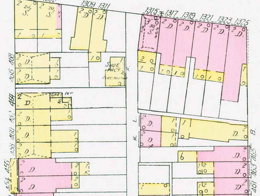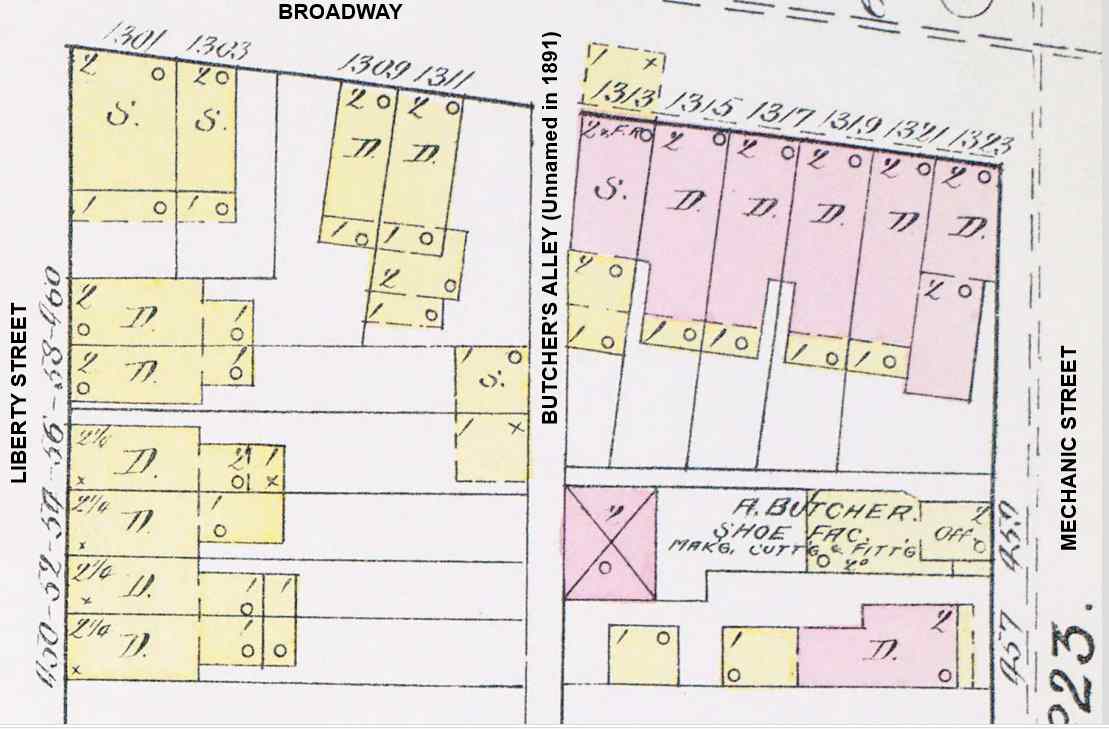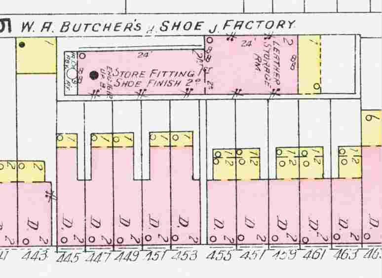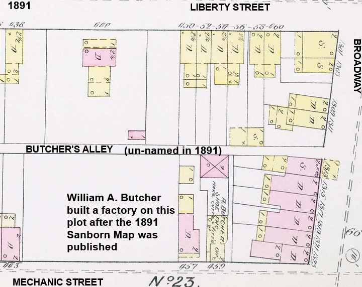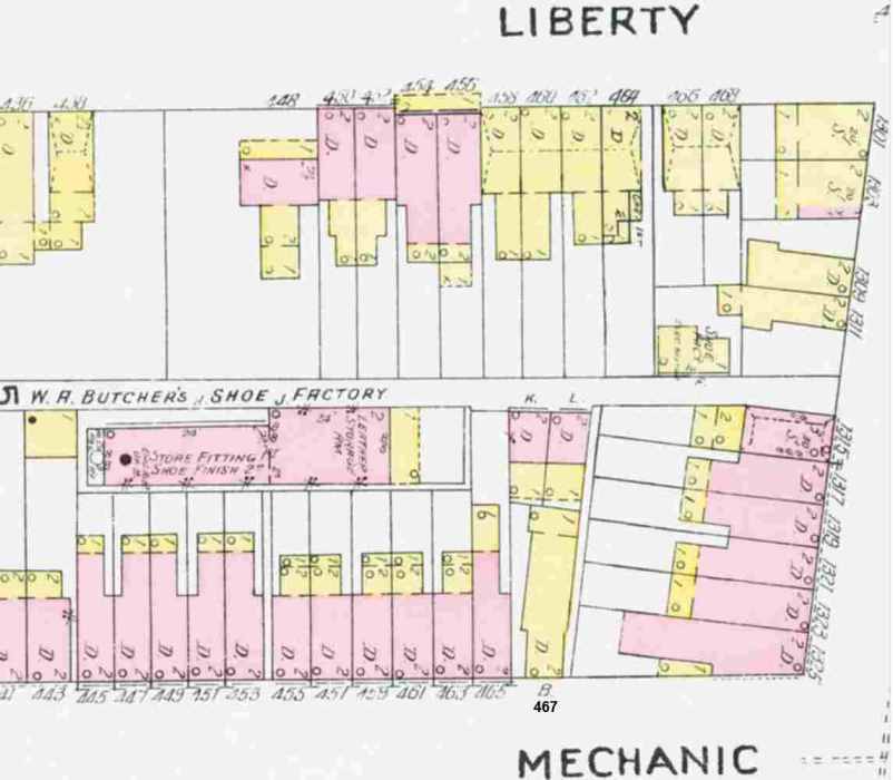 SANBORN MAP - 1906 At some point between 1891 and the publication of the 1906 Sanborn Map, William A. Butcher built a new factory on Butcher's Alley and razed and rebuilt his old plant. Homes were built on Mechanic Street and the two lots that had existing structures were renumbered, with 457 becoming 465 and 459 becoming 467 Mechanic Street. |