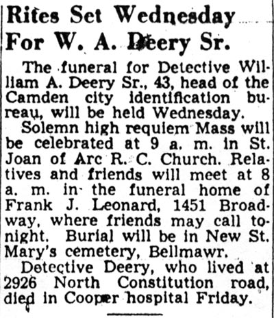 WILLIAM A. DEERY served as a member of the Camden Police Department. Trained by the FBI to work with fingerprints, he served as the head of Identification Bureau in Camden in the 1940s. The post had been previously held by Rox Saponare and others. The 1947 Camden City Directory shows that Willaim A. Deery and Family were then living at 2926 North Constitution Road in the Yorkship Square neighborhood of Camden. His next door neighbor wasCharley Humes, columnist for the Courier-Post. The two became close friends. William A. Deery passed away on December 29, 1950. He was survived by his wife, Mary, and sons William Jr., Thomas and John Deery. |