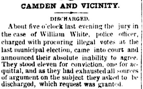 DEAD William H. White, aged 70 years, one of the best known men down town, died on Saturday at the residence of his daughter at Almonesson, N.J. where he had been living for about five months. About three years ago Mr. White was stricken with paralysis of the left side rendering his arm and leg helpless. He had finished eating his supper about twenty minutes, when he suddenly lifted both arms above his head, rose from his chair and fell back dead. A physician who was summoned said that death was undoubtedly due to another stroke of paralysis. The funeral will take place on Wednesday afternoon at 2 o'clock from the residence of his daughter Mrs. Joseph Farley, 834 Carpenter Street. Interment will be private. The remains can be reviewed Tuesday evening. William H. White was born in Philadelphia and in his early life worked as a moulder for the Jesse W. Starr Iron Works, now the R.D. Wood Iron Works. During the Civil War Mr. White cast a number of bombs and shells for use in that deadly conflict. For years Mr. White kept a hotel at Mechanics Hall, now Washington Hall, then located in what was known as the South ward. He always took an active part in politics and during the days of George M. Robeson was one of the latter's foremost political friends. Mr. White served as a policeman under Mayor Gaul and was connected with the Water Department for over twenty years. He was a member of the Fifth Ward Republican Club and Shiffler Hose Company volunteers, both of which organizations and the R. D. Woods Iron Works Employees, will send delegations to the funeral. When first stricken with paralysis Mr. White was visited by ex-Sheriff Calhoun and several other old-time friends who talked consolingly to him. "Don't worry about me," was White's invariable reply, " I'll outlive all of you." His prediction came true.------------------- |