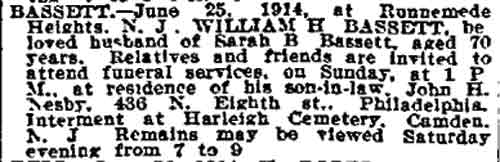 William H. Bassett was born in Pennsylvania in June of 1844, according to the 1900 Census. He married in the late 1860s, and was living in Camden's South Ward when the Census was taken in 1870. As stated above, he was appointed to the Camden Fire Department on March 18, 1873, and lived at 517 Benson Street into 1877. The 1878 Camden City Directory gives his address as 623 Royden Street, The Bassett family moved to 310 Stevens Street prior to the compilation of the 1879 City Directory. The Bassetts were at that address when the 1880 Census was taken, then moved to 817 Market Street, where they stayed as late as 1887. William Bassett returned to the Fire Department as Foreman of Engine Company 2 on April 5, 1882, and served in that capacity for two years. In 1884 and 1885 William Bassett and Isaac M. Shreeve were partners in a painting business called Bassett & Shreeve's. In 1888 William H. Bassett and family were living at 515 Benson Street, where they stayed through at least 1890. The 1892-1893 Camden City Directory shows that William H. Bassett and Joseph Lynn were the principals in a painting business called Lynn and Bassett, located at 24 South 5th Street. William H. Bassett and family were then living at 563 Mickle Street. The Bassetts remained at this address for several years, last appearing in Camden's City Directories in 1897. The 1898 Camden City Directory states that he had moved to Philadelphia, where he appears in the 1900 and 1910 Censuses. William H. Bassett died on June 25, 1914 at Runnemede Heights, New Jersey. After funeral services at the home of his son-in-law in Philadelphia, he was buried at Harleigh Cemetery,. |