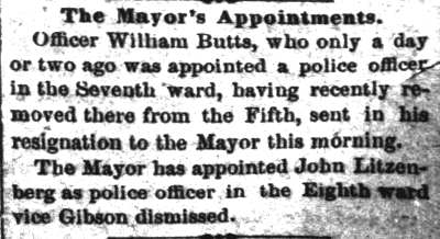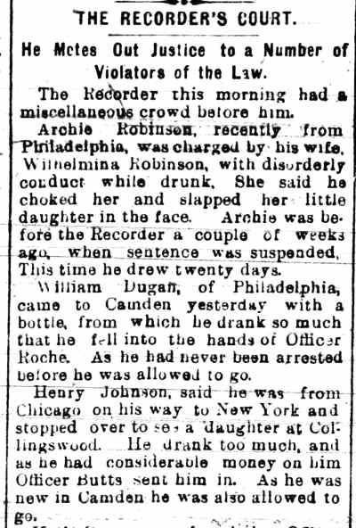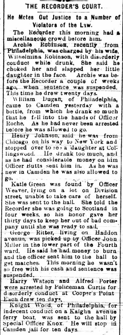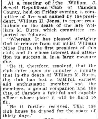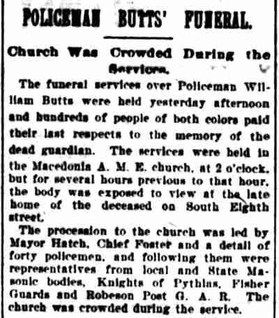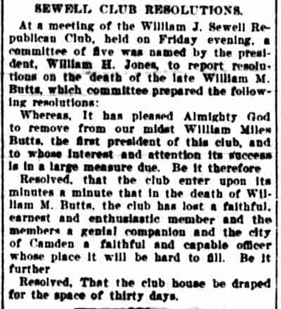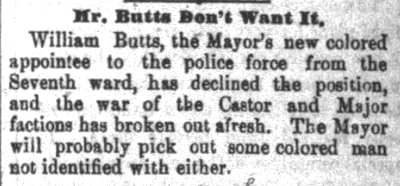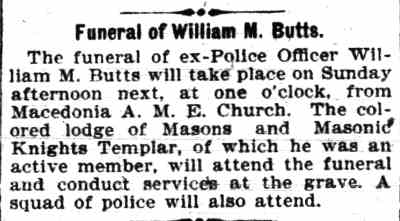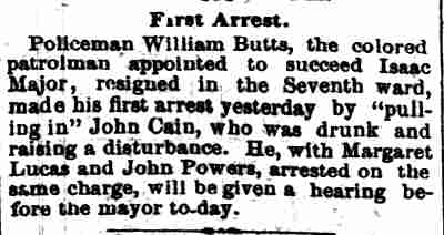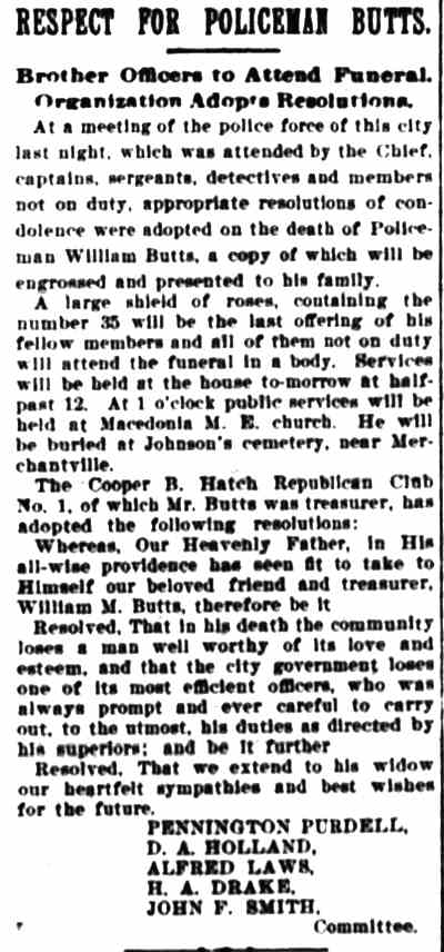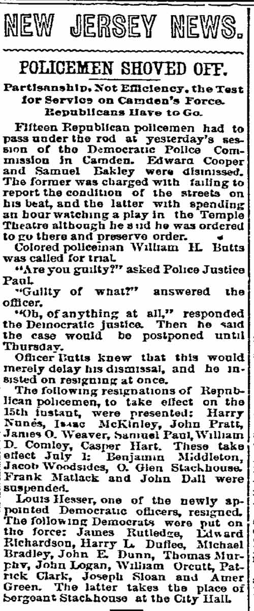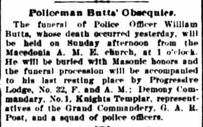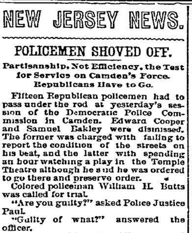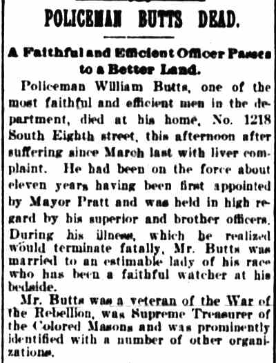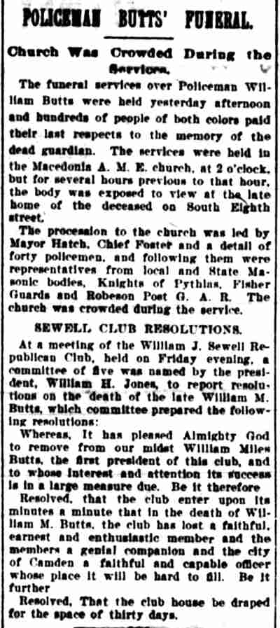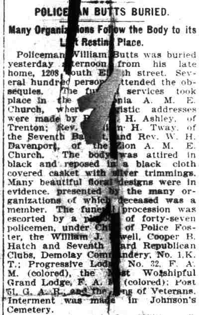 lifetime. William Butts does not appear to be listed in Camden's city directories until 1878, however, a contemporary recalled working with William Butts at the Browning Dye Works for fifteen years prior to his appointment as a policeman. William Butts married Ellen "Lizzie" Smith at Macedonia A.M.E. Church on December 24, 1873 in Camden's Fifth Ward. It is probable that William and Lizzie Butts are the "James" and "Lizzie" listed at 423 Spruce Street in 1877, and William Butts may well be "M.H. Butts" who in 1878, is listed as a laborer at 336 Pine Street in that year's City Directory. The 1879 edition lists William Butts, laborer, at 917 Locust Street. He and his wife were at 919 Locust Street when the Census was taken in 1880. In 1881 a William Butts, laborer is listed at 638 John Street, which was renamed as the 600 block of Locust Street not long afterwards. He was at 309 Division Street in 1884 and 228 Division Street in 1885, still working as a laborer. Late in 1886 as early in 1887 he moved to 707 Cherry Street in Camden's Seventh Ward, where he lived into 1899. He was still at that address when the 1890 Veterans Census was enumerated. Sadly, Lizzie Butts died at 270 Division Street, from peritonitis most likely brought on by a burst appendix, on July 28, 1890. Active in Masonic and in political affairs as a Republican, William Butts was elected as a delegate to the Camden County convention in October of 1882 from the Fifth Ward. After moving to the Seventh Ward, he was appointed to the police department in April of 1887. He is generally credited as being the first black policeman in Camden, but this is not quite the case. In the summer of 1886 Mayor Jesse Pratt declared his intention to appoint two black men to the Camden Police Department, one from the Seventh Ward and one from the Eighth. In 1886 he appointed John Wesley "Wes" Beckett from the Eighth Ward, who served for several years. In April of 1887 Mayor Pratt appointed William Butts, a loyal Republican and newly moved to the Seventh Ward to serve, as he was not aligned with either of the two factions of black Republicans seeking to secure the appointment, one favoring Isaac Major and the other constable George Castor. William Butts initially declined the offer, and Isaac Major took the job. Continued political infighting between the two factions led to Major's resignation from the police department in July of 1887. William Butts was again appointed, accepted the position, and made his first arrest on July 17, 1887. William Butts served with honor and distinction until the late spring of 1893, when he and virtually every other Republican policeman was dismissed by the Democratic-controlled Police Commission. He was reappointed by Mayor John L. Westcott on March 30, 1894, after the New Jersey legislature and New Jersey Supreme Court ordered the Commission to disband. William Butts retuned to the police department saw him serve the City of Camden for another five years, until he was taken ill in the spring of 1899. He fell seriously ill in April of 1899 and married a dressmaker, the former Caroline Brooks Billups of 1218 South 8th Street, on May 15, 1899. William Miles Butts passed away at the South 8th Street address on July 27, 1899, survived only by his wife Caroline. Mrs. Caroline Butts appeared in city directories in Camden until 1943. Besides police work, William Miles Butts was respected all through Camden for his activities in veterans, political, and Masonic affairs. He was a member of the William P. Robeson Post No. 51, G.A.R; Progressive Lodge No. 32, F. & A.M.; Demolay Commandery No. 1, Knights Templar; the William J. Sewell, the Cooper B. Hatch, and the Seventh Ward Republican clubs. |