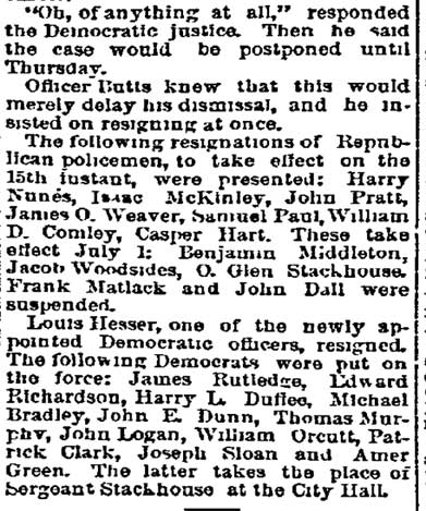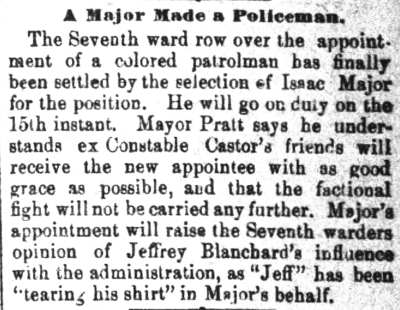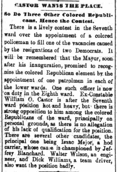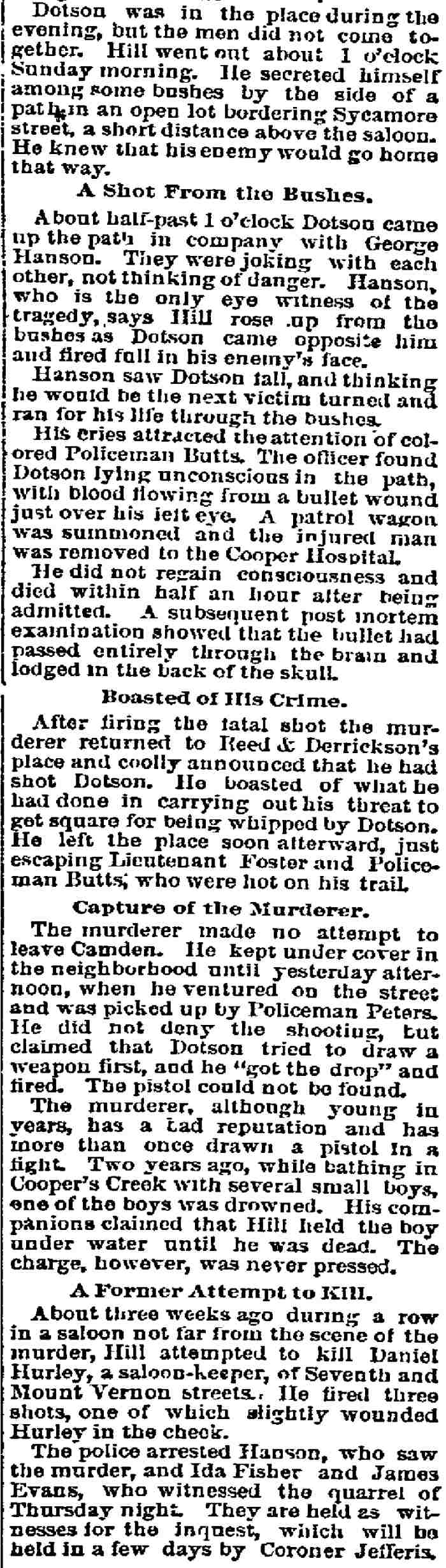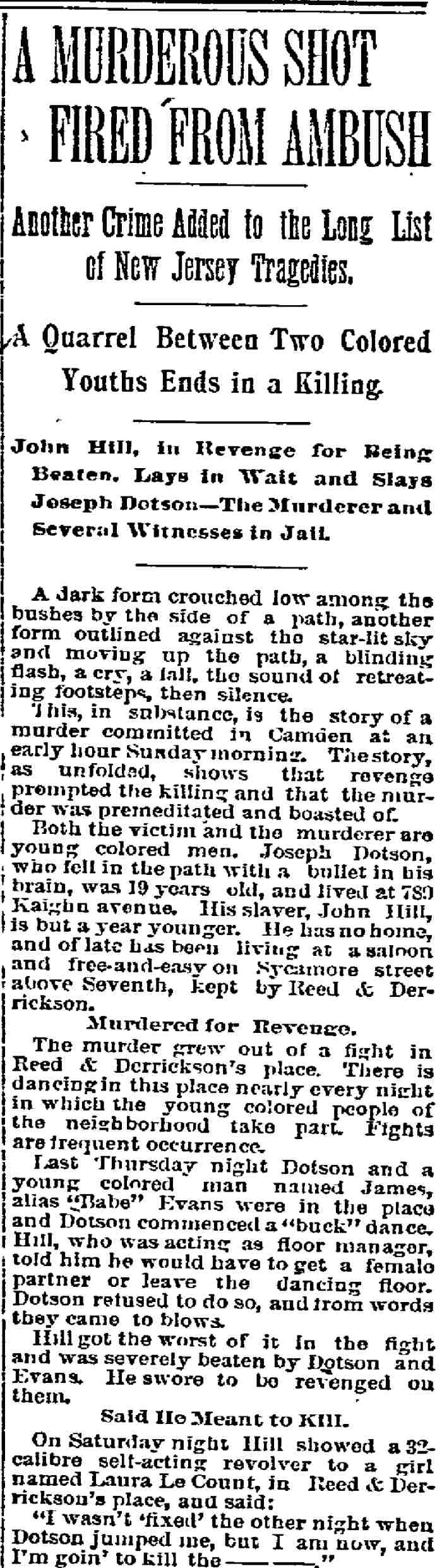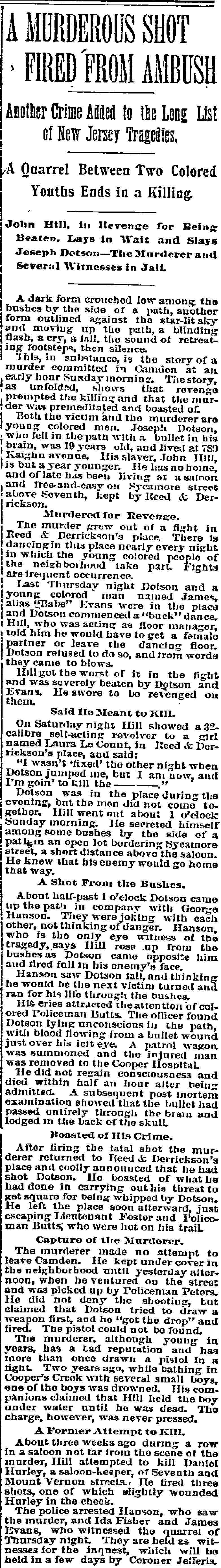 lifetime. William Butts does not appear to be listed in Camden's city directories until 1878, however, a contemporary recalled working with William Butts at the Browning Dye Works for fifteen years prior to his appointment as a policeman. William Butts married Ellen "Lizzie" Smith at Macedonia A.M.E. Church on December 24, 1873 in Camden's Fifth Ward. It is probable that William and Lizzie Butts are the "James" and "Lizzie" listed at 423 Spruce Street in 1877, and William Butts may well be "M.H. Butts" who in 1878, is listed as a laborer at 336 Pine Street in that year's City Directory. The 1879 edition lists William Butts, laborer, at 917 Locust Street. He and his wife were at 919 Locust Street when the Census was taken in 1880. In 1881 a William Butts, laborer is listed at 638 John Street, which was renamed as the 600 block of Locust Street not long afterwards. He was at 309 Division Street in 1884 and 228 Division Street in 1885, still working as a laborer. Late in 1886 as early in 1887 he moved to 707 Cherry Street in Camden's Seventh Ward, where he lived into 1899. He was still at that address when the 1890 Veterans Census was enumerated. Sadly, Lizzie Butts died at 270 Division Street, from peritonitis most likely brought on by a burst appendix, on July 28, 1890. Active in Masonic and in political affairs as a Republican, William Butts was elected as a delegate to the Camden County convention in October of 1882 from the Fifth Ward. After moving to the Seventh Ward, he was appointed to the police department in April of 1887. He is generally credited as being the first black policeman in Camden, but this is not quite the case. In the summer of 1886 Mayor Jesse Pratt declared his intention to appoint two black men to the Camden Police Department, one from the Seventh Ward and one from the Eighth. In 1886 he appointed John Wesley "Wes" Beckett from the Eighth Ward, who served for several years. In April of 1887 Mayor Pratt appointed William Butts, a loyal Republican and newly moved to the Seventh Ward to serve, as he was not aligned with either of the two factions of black Republicans seeking to secure the appointment, one favoring Isaac Major and the other constable George Castor. William Butts initially declined the offer, and Isaac Major took the job. Continued political infighting between the two factions led to Major's resignation from the police department in July of 1887. William Butts was again appointed, accepted the position, and made his first arrest on July 17, 1887. William Butts served with honor and distinction until the late spring of 1893, when he and virtually every other Republican policeman was dismissed by the Democratic-controlled Police Commission. He was reappointed by Mayor John L. Westcott on March 30, 1894, after the New Jersey legislature and New Jersey Supreme Court ordered the Commission to disband. William Butts retuned to the police department saw him serve the City of Camden for another five years, until he was taken ill in the spring of 1899. He fell seriously ill in April of 1899 and married a dressmaker, the former Caroline Brooks Billups of 1218 South 8th Street, on May 15, 1899. William Miles Butts passed away at the South 8th Street address on July 27, 1899, survived only by his wife Caroline. Mrs. Caroline Butts appeared in city directories in Camden until 1943. Besides police work, William Miles Butts was respected all through Camden for his activities in veterans, political, and Masonic affairs. He was a member of the William P. Robeson Post No. 51, G.A.R; Progressive Lodge No. 32, F. & A.M.; Demolay Commandery No. 1, Knights Templar; the William J. Sewell, the Cooper B. Hatch, and the Seventh Ward Republican clubs. |