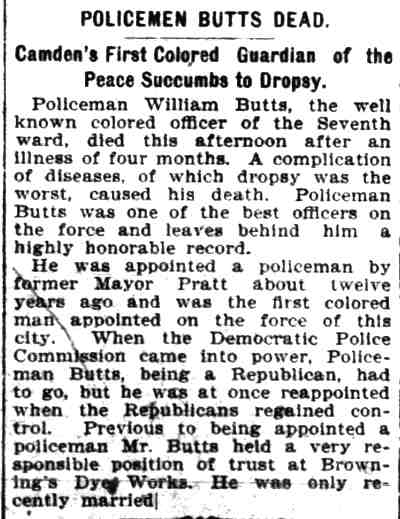 WILLIAM MILES BUTTS is generally credited as being the first black man to serve as a member of the Camden Police Department. He was, in fact, the third to hold that honor, coming after, for reasons outlined below, John Wesley "Wes" Beckett and Isaac Major. He was born