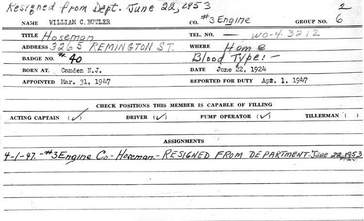 William C. Butler was appointed to the Camden Fire Department on March 31, 1947 and reported for duty the next day with Engine Company 3 at 1813 Broadway in the old Eighth Ward. He was then living with his wife Constance at 553 Roberts Street in South Camden. By the spring of 1953 he had moved to 3265 Remington Avenue in East Camden. The Butlers do not turn up in any telephone directories in Camden and apparently left the city. William C. Butler turned in his resignation from the Department effective June 22, 1953. A resident of Burlington, New Jersey at the time of his death, William C. Butler died on August 13, 1998. Constance E. Butler joined her husband on October 29, 2000. |