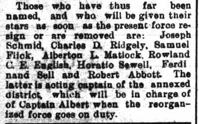 This story erred in reporting, as retirement at age 65 was NOT mandatory at the time. William E. Albert, Richard Golden, Frank Matlack, and Edwin Thomas did retire. John Golden, john painter, Charles Fitzsimmons, Thomas Brothes, and William Lyons continued to work in the Police Department. John Golden was eventually promoted to Chief of Police. |