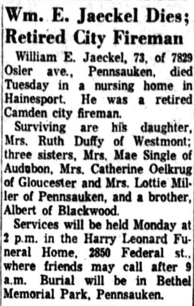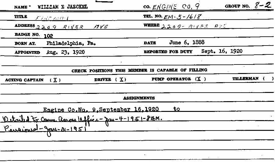 Hook & Ladder Company 3: Captain Joseph B. Ayres, FF Dave Humphries, Al Dukes, John Mulligan, Bill Mountney, Bill Hopkins. Hose & Chemical Company 1: Captain Charles H. Robinson, FF William E "Pud" Jaeckel, George Townsend, Ken Naylor, Howard Gick. Engine Company 9: Captain John H. Vickers, FF Irv Lederman, Newton Ash, Joe Gentlesk, Al Palmer |