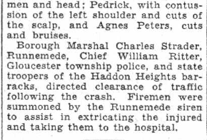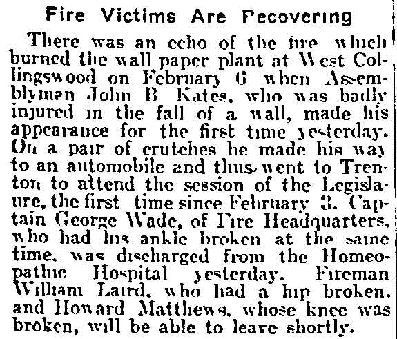 Marter Joseph Sparks - George Boone - Roy A. Smith - Edward Simpson - Henry C. Knowles Samuel S. Elfreth - George P. Cox - Walter W. Browning - George B. Wade - John A. Stockton Joseph F. Ernst - John A. Dold - Josiah Sage - Daniel Smith - Arthur Wingate - Joseph T. Johnson Harry Hankins - William Laird - William Elberson - John H. Lennox - Martin Carrigan - Charles Cook Harry Selby - Herman O. Kreher - Daniel P. McConnell - William Howell Tatem Harry C. Anderson - Steward Bakley - Joseph Maxwell William Robinson - Richard Sauer - John Watson - Albert Glanders - Ladder Company 1 Charles Menke - Edward S. Gahan - Engine Company 7 - Engine Company 2 |