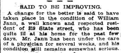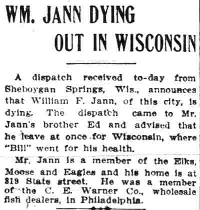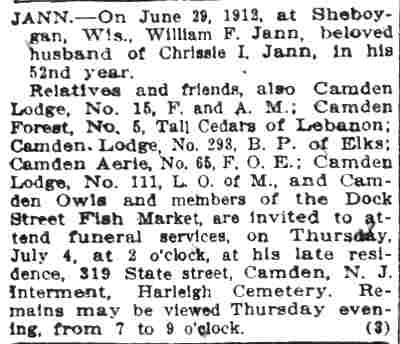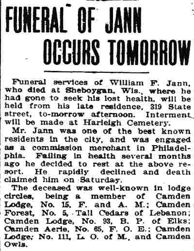 WILLIAM F. JANN was active in many fraternal organizations in Camden. His affiliations included Camden Lodge No. 15, Free and Accepted Masons; camden lodge no. 293, benevolent protective order of elks; Order of Owls; Camden Lodge No. 111, Loyal Order of Moose; and Camden Aerie No. 65, Fraternal Order of Eagles. He worked in sales, lastly as a commission merchant involved in the wholesale fish trade. William F. Jann was born in Pennsylvania on November 19, 1860. He appears in Camden City Directories in 1885 at 206 North 11th Street, working as a salesman, a trade he followed all of his working life. His wife Chrisie had gave birth to a daughter, Alice Jann, around the time of the move to Camden. The family remained at the North 11th Street as late as 1899. The 1901 City Directory shows the Jann family at 1101 Federal Street, where they stayed for a few years. By 1906 William Jann and family had moved to 643 Market Street. The 1910 Census list the family at 309 State Street, while City Directories for 1910. 1911, and 1912 has the at 319 State Street. William F. Jann fell ill in the spring of 1912. He went to Sheboygan, Wisconsin for his health, which failed to improve. He passed away on June 29, 1912. His body was brought home and he was interred at Harleigh Cemetery. |