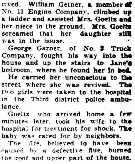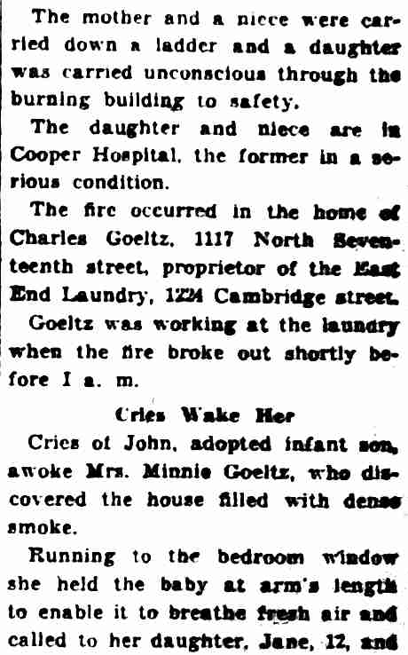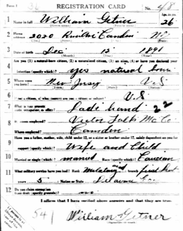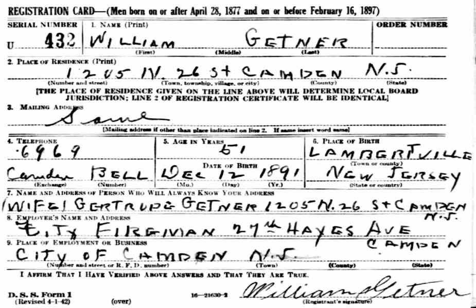 WILLIAM GETNER was born in Lambertville, New Jersey on December 12, 1891. He appears to have come to Camden after 1910. William Getner married Gertrude Selah in the early 1910s. A daughter, Emma, was born around 1914. The 1914 City Directory shows them living at 2306 River Road. When he registered for the draft on June 5, 1917 William Getner was married and a father. He was living at 2020 River Road in Camden's Cramer Hill neighborhood. He was then working at the Victor Talking Machine Company factory. Another daughter, also named Gertrude, was born in 1919. When the census was taken in January of 1920, the Getners were still living at 2020 River Road, along with Gertrude's parents, Joseph and Emma Selah, and their son Abraham. William Getner was then working as a ship carpenter in one of the many shipyards in Camden. By 1924 the family had moved to 1205 North 26th Street. William Getner was appointed to the Camden Fire Department at some point prior to the compilation of the 1927 Camden City Directory. William Getner was still serving with the Camden Fire Department in the spring of 1942 when he registered for the draft. By 1947 he had left the Fire Department and was working as a guard. He was still living at 1205 North 26th Street. He died on June 19, 1947. |
