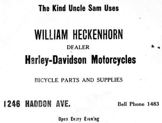 WILLIAM HECKENHORN was born on October 9, 1883 in Pennsylvania to Henry and Mary Dittmar Heckenhorn. His first cousin was William Penn Partenheimer Jr., longtime head of the YMCA in Camden. Henry Heckenhorn moved his family to Camden in the mid-1880s. By 1890 the family was living at 921 South 8th Street. Older brother George Heckenhorn worked briefly as a drive of the Camden Horse Railroad Company, and later as Camden's first electric trolley car driver before being hired by the coffee firm of William S. Scull & Company, for whom he would work for fifty years. Younger brother Louis would have a 46 year career with New Jersey Bell and was well known in Moorestown, where he had moved to. Besides George and Louis, William Heckenhorn had two older sisters, Kate and Sarah, and two younger brothers, Edward, Louis, and Howard. Sadly, youngest brother Howard was killed in a traffic accident as a young boy. William Heckenhorn married his wife Mabel when he was 23. A son, Howard Heckenhorn, was born to the couple on August 23, 1909. When the 1900 Census was taken the William Heckenhorn family owned a home at 1044 Lawrence Street. He was working as a toolmaker at the Esterbrook pen factory. The William Heckenhorn family remained on Lawrence Street through 1910. His father and brothers had moved to the 700 block of Cherry Street by this time; brother George Heckenhorn would reside there as late as 1952, at 772 Cherry Street. In late 1911 or early 1912 William Heckenhorn went into business for himself, opening up a bicycle shop at 15 South 4th Street. He and his family made their home at this address as well. He became interest in motorcycles around this time. It is quite possible that he started selling Harley-Davidson motorcycles while still at this location. In 1915 William Heckenhorn opened a Harley-Davidson motorcycle dealership at 1246 Haddon Avenue. As before, he made his home on premises. A youngster named Frank De Viney was fascinated by motorcycles as a boy, and spent much of his free time at William Heckenhorn's shop. Frank De Viney eventually was hired by William Heckenhorn. William Heckenhorn's motorcycle business was still open as late as February 1919, when he placed an advertisement in the banquet program of the Jefferson Athletic Association, a social and sports club from Camden's Eighth Ward. By January of 1920 William and Mabel Heckenhorn had purchased the house at 1444 Belleview Avenue in Camden's parkside section. The Census indicates that he was then working as a machinist at a pen manufacturing company, however he still was in the motorcycle business, as evidenced by the 1921 R.G. Dun Mercantile Agency Reference Book indicates that he still was in the bicycle and motorcycle business. 1923 William Heckenhorn was not the Harley-Davidson franchise holder, as in that year, Frank De Viney opened a Harley dealership of his own, the successor to William Heckenhorn's operation, at 1124-1126 kaighn avenue. De Viney would sell Harley-Davidson motorcycles in Camden into the 1930s. According to Camden City Directories, William Heckenhorn remained in the motorcycle business through 1926. After leaving the motorcycle business William Heckenhorn worked as a superintendent for the New Era Concrete Company, according to the 1928 Camden City Directory. He then pursued a career in financial services. The 1920 Directory shows him working as a stockbroker. After the market crashed in 1929, William Heckenhorn worked as a bank bookkeeper before returning to work as a stockbroker. When the next census was taken, in April of 1930, William Heckenhorn was working as a bookkeeper in a bank. Still at home was son Howard Heckenhorn, then 20. At