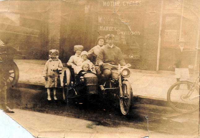 Heckenhorn, astride a Harley-Davidson Motorcycle His wife Mabel is in the sidecar, holding his son Howard Heckenhorn Photograph from early 1910s courtesy of Lee Ryan |