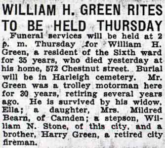 WILLIAM H. GREEN was born around 1859 in New Jersey to Joseph and Julia Green. The 1880 census shows the family residing at 816 South 2nd Street. His father was then working as a grain weighmaster. Both William and his brother Henry H. "Harry" Green were then working as laborers. A sister, Mamie, also was at home. The brothers appear to have lived in Cramer Hill in the late 1880s, where Harry Green had a store and William worked as a salesman. William H. Green married his wife, Ella, shortly after the census was taken. The Green brothers appear to have lived in Cramer Hill in the late 1880s, where Harry Green had a store and William worked as a salesman. William H. Green found work around the turn of the century as trolley car operator in Camden, a position he held until his retirement in the early 1930s. William and Ella Green's daughter Mildred was born around 1905. By 1920 William H. Green owned a home at 572 Chestnut Street. William H. Green passed away on August 17, 1936 and was buried at Harleigh Cemetery in Camden. He was survived by his wife, daughter, a step-son, William N. Stone, and his brother Harry, a retired Camden city fireman. |