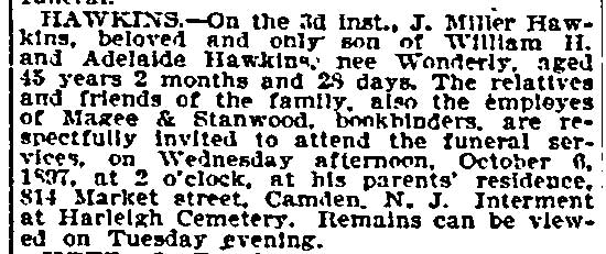 George Reeser Prowell wrote about the two companies in his History of Camden County, New Jersey which was published in 1886. The Independence Fire Company No. 1 , organized with Lambert F. Beatty, president; William S. Frazer, secretary; and Joseph Wagner, treasurer. Among the early members were Jacob Prettyman, David Page, Thomas Stites, Andrew Stilwell, Francis E. Harpel, Restore Cook, John Wallace, Claudius W. Bradshaw, William H. Hawkins, Christopher J. Mines, Henry Bradshaw, William E. Walls, William Howard, Albert Dennis, Elwood Bounds, Samuel H. Stilwell, Albert V. Mills, Robert S. Bender, Lewis Yeager, Thomas McCowan and William W. Mines . The company met in a building at Third Street and Cherry for a year, when it was burned. Lewis Yeager gave the company free use of a lot on Third Street, above Cherry, where an engine-house of slabs, donated by Charles Stockham, was built. In 1853 a lot on Cherry Street, above Third, was purchased and on it a frame house was built. This was used until 1859, when, owing to a defect in the title, the sheriff advertised the property for sale. When he reached the ground on the day of the sale he found the house, with its contents, and a number of the members of the company, on an adjoining lot belonging to James B. Dayton, who permitted the action. The following year, 1860, they bought and built, on the north side of Pine Street, above Fourth, a three-story brick, then the most complete fire-engine house in Camden, and which was sold for four thousand five hundred dollars to the city. The Independence was a hose company until June 4, 1864, when they secured an Amoskeag engine, being the first fire-engine in use by the fire companies of Camden. Early in 1869 they purchased a larger engine and when the volunteer firemen were scattered, in the latter part of that year, they sold the Amoskeag to Millville, and the later purchase was kept until 1874, when it was sold to the city. Lambert F. Beatty, John Wallace, William H. Hawkins, J. Kelly Brown, William W. Mines and Edward Gilbert were presidents of the Independence, while its secretaries have been William L. Frazer, William W. Mines, Mortimer C. Wilson and Thomas McCowan; and the treasurers Joseph Wagner and Robert S. Bender, who, elected in 1854, served until October 13, 1874, when, with a roll of sixty members, they met. President Gilbert in the chair, paid all claims against them and formally disbanded. On July 4, 1852, the Fairmount Fire Company was organized by William C. Figner (president), William J. Miller (secretary), Frederick Breyer (treasurer) , William H. Hawkins, John W. Hoey, Henry A. Breyer and Alfred H. Breyer. They rented a one-story frame building on Pine Street, below Third, which the Shinier had vacated, and the City Council gave them the old Fairmount engine. George W. Watson, Anthony R. Joline, Thomas Francis, John L. Ames, George W. Howard, William F. Colbert, Francis Fullerton, John S. Boss, Joshua Spencer, Lawrence Breyer, William H. Lane and James Scout were enrolled as additional members. On February 17, 1853, a charter of incorporation was obtained, and on February 10, 1854, the name of the company was changed to "United States Fire Company, No. 5." James Scout was chosen president, and George Deal, secretary. They secured a first-class engine, bought ground and built a commodious two-story frame house at No. 231 Pine Street, which continued to be the headquarters of the company until it disbanded, with the other volunteer fire companies, in 1869. A saddler by trade, William Hawkins served as a constable in Camden's Middle Ward in the late 1860s and early 1870s, and in the late 1870 s was a member of Camden's police department. As stated above, son J. Miller Hawkins served with the Camden Fire Department, for approximately a year from his initial appointment in May of 1876. The Hawkins family was living on or near the northwest corner of Broadway and Mickle Street in 1875. The Hawkins family moved around quit often in the 1870 s, 1880 s, and into the 1890 s. City Directories from the years between 1878 and 1897 record no less than nine different addresses. In 1878 the family was at 35 Broadway, in 1879 and 1880 they were at 22 Haddon Avenue, in 1881 the address was 726 Federal Street, 833 Bridge Avenue in 1883. The 1884 Directory shows the Hawkins family at 218 Amber Street, and at 208 Point Street in 1885. By 1888 the family had gone to 218 Royden Street, and 1890 saw them at 136 Mount Vernon Street . By July of 1890 they had again relocated, this time to 1024 South 2nd Street . By the latter half of 1892 the Hawkins family was living at 814 Market Street. From 1883 through 1887, City Directories show William H. Hawkins working as a watchman at the Camden Safe Deposit Company bank, which in time became known as the Camden Trust. Thomas McCowan, who had been a member of Independence Fire Company No. 1 with William H. Hawkins, was a co-worker at the bank. The 1888 - 1889 City Directory shows that he had gone back to work as a saddler. He was working in that profession when, in 1890, despite being over 60 years of age, he secured an appointment to the Camden Fire Department. He worked for the department into 1891, most likely in the role of a houseman, whose job it was to secure the firehouse once the apparatus and firefighters had left quarters. William H. Hawkins secured another government posy in 1892 when he went to work as a messenger in Vice Chancellor's Court. He served as the Court 's Sergeant-at-Arms in 1894 and 1895. The 1896 Camden City Directory states that he was once again working for the Camden Fire Department, as a houseman. No occupation is given in the 1897 Directory. The 1898 Directory states that William H. Hawkins was working as a clerk. William H. Hawkins' son J. Miller Hawkins died on October 3, 1897 and was buried at Harleigh Cemetery. The Hawkins remained at 814 Market Street into 1898, then moved to 411 Arch Street the following year. William H. Ha