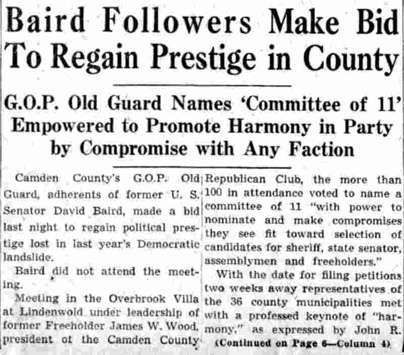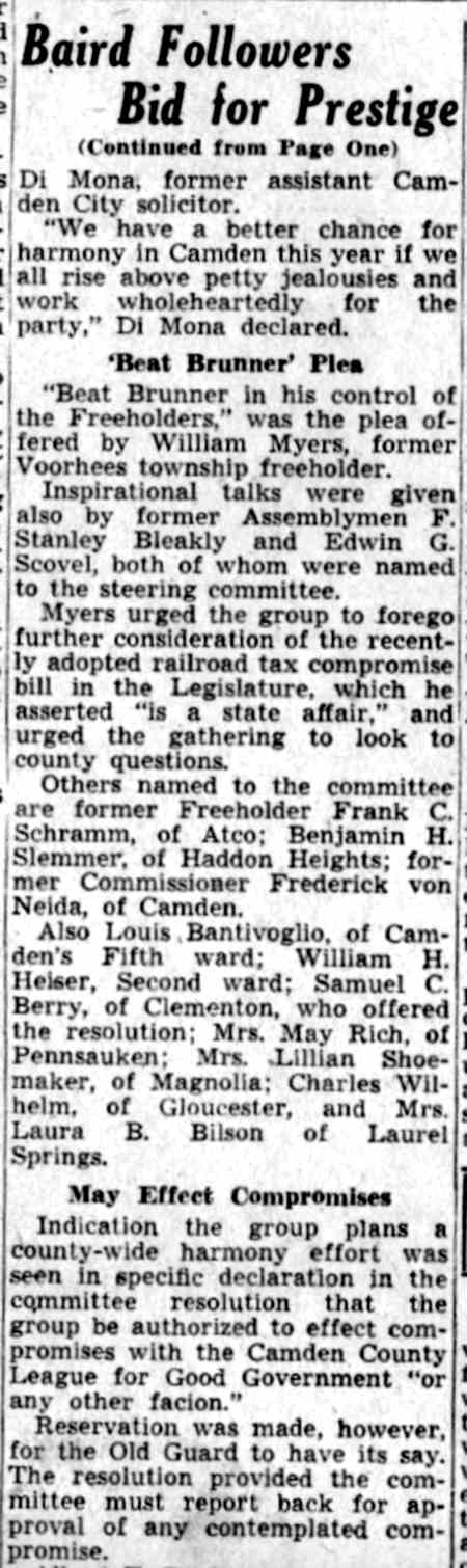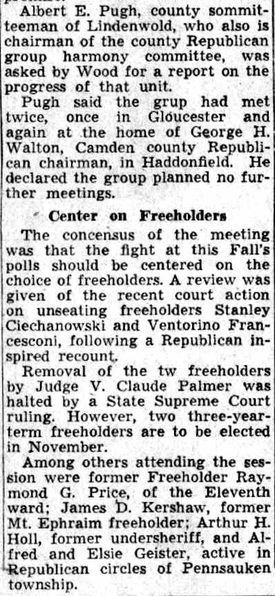 Freeholder Contest Three-cornered battles in Clementon and Delaware township will mark freeholder contests at the November 3 election. Ballots will be casts for an entire new board of freeholders, with 38 to be elected. Boroughs to have freeholders representation for the first time as a result of recent legislation are Clementon, Lindenwold, Oaklyn, Woodlynne, Mt. Ephraim and Runnemede. Rivals in the three-cornered fight in Clementon are Theodore W. Gibbs, Republican Organization nominee; Frank C. Somers, running as a Republican Independent, and Herbert P. McAdams, the Democratic nominee. The triangular race in Delaware township finds Frank N. Walton, Republican Organization; J. Watson Matlack, Republican Independent, and Augustus A. Cornet, Democrat, as the contestants. Nine members of the present board of freeholders will not be on the ballot for re-election. All are Republicans. They are Benjamin W. Sykes, Eighth Ward; Joseph Tarpine, First Ward, Gloucester; Philip Stohlbergel, Audubon; Joseph H. Van Meter, Collingswood; William J. Dallas, Haddon Heights; James W. Davis, Clementon; Charles C. Durges, Haddon township; Theodore Schleinkofer, Waterford township, and William A. Robinson, Winslow .. Joseph Bennie, Third Ward, Camden, is the only Democratic member on the present board. He is seeking a re-election and is opposed by Daniel Auletto, Republican nominee. Candidates listed on the ballots in the various wards and municipalities follow: Camden Wards First Ward-Samuel D. Payne, R.; Thomas J. Kittel, D. Second-William H. Heiser, R.; William Kunitz, D. Third-Daniel Auletto, R.; Joseph Bennie, D. Fourth-William L. Roberts, R.; Nicholas A. La Marra, D. Fifth-C. Leonard Brehm, R.; Leon Perozzi. D. Sixth-Harry J. Burrichter, R.; A. W. Lazro, D. Seventh-Mrs. Mary D. Guthridge, R.; Theodore Buczkowski, D. Eighth-Walter Sekula, R.; George S. W. Spaide. Ninth-Francis B. Bodine, R.; S. V. Waddy, D. Tenth-Samuel J. Edwards, R.; Edward J. Fox, Sr., D. Eleventh - Howard Firth, R.; Charles T. Johnston, D. Twelfth-John T. Rodan, R.; Wilbert H. Joslin, D. Thirteenth-William P. Cotter, R.; Frank E. Zimmerman, D. Fourteenth-Charles H. Genther, R.; George E. Brunner, D. |