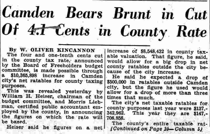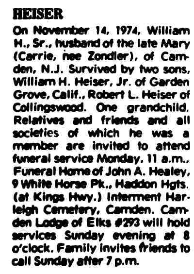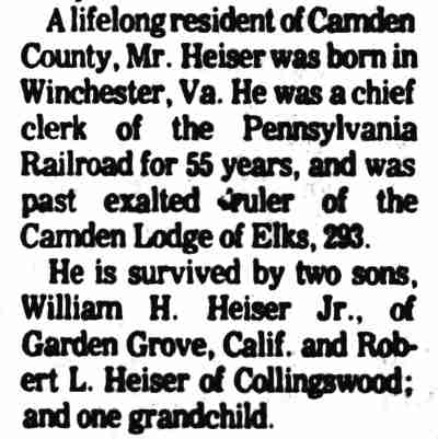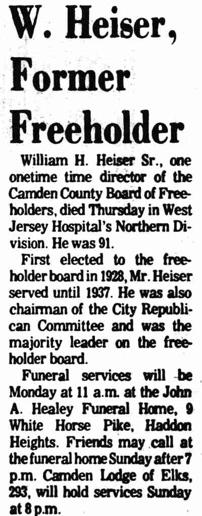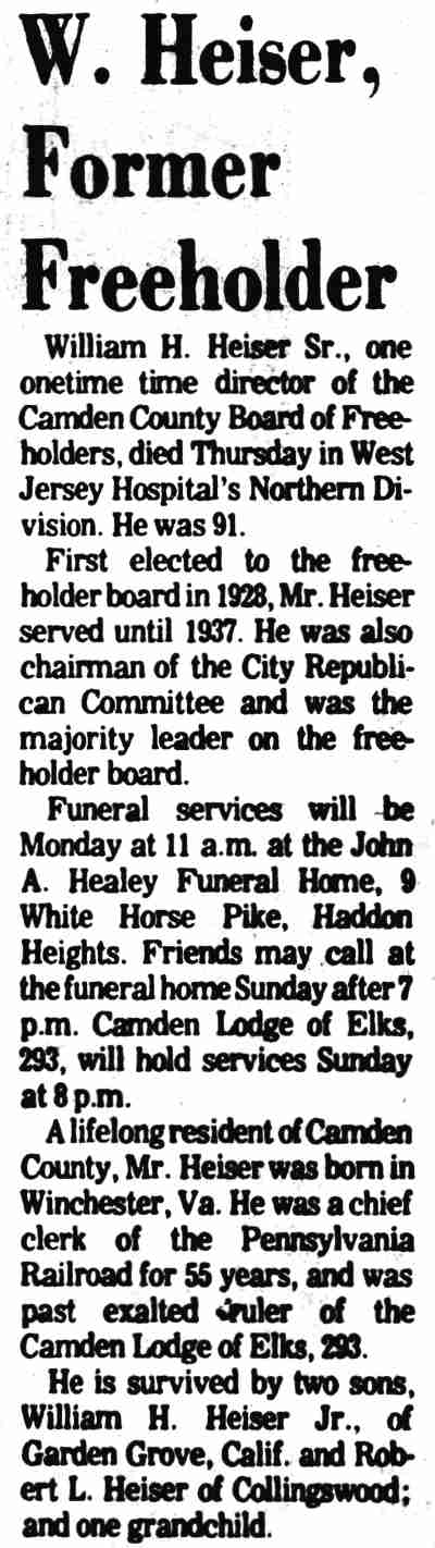 WILLIAM H. HEISER was born in Virginia around 1884. He married the former Carrie Van Saun around 1905. The Heiser family made its home in the 1920s and 1930s at 633 Linden Street in Camden's old Second Ward. William Heiser worked as an accountant with the Pennsylvania Railroad. At home at the time of the 1930 Census were sons Albert, William, and Robert. Albert, then 21, worked as an engineer at the RCA-Victor radio factory. Active in local politics, William H. Heiser served on the Camden County Board of Freeholders from Camden's 2nd Ward in 1930 and 1931, and also in 1936. By 1947 he had moved to Parkside, where he hand wife Carrie lived at 1403 Princess Avenue. Son Robert lived next door at 1401 Princess, and worked as a salesman for Western Auto Store, which was located at Broadway and Chestnut Street in those years. The 1956 New Jersey Bell Telephone Directory lists William Heiser at 631 Linden Street, and the 1959 Directory shows him at 623 Linden. The 1970 Directory also lists at William Heiser at 125 North 3rd Street. William H. Heiser passed away on November 14, 1974, survived by his sons William H Jr. and Robert L. Heiser. |