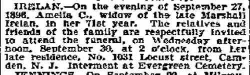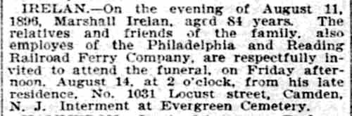 William Irelan was born in New Jersey is 1858 to Marshall Irelan and his wife, the former Amelia Taylor. His father worked as a stevedore and as a day laborer. The Irelan family was living in Camden's South Ward at the time of the 1860 Census. Besides William there was an older sister, Mary and an older brother, also named Marshall. The Irelan family was still living in Camden's South Ward when the Census was taken in 1870, and were still in South Camden at the time of the 1880 Census enumeration. The family was then living at 1031 Locust Street. Marshall and Amelia Irelan were still at that address as late as 1896. William Irelan appears to have married in 1882. The 1993-1884 City Directory shows William Irelan at 1033 Locust Street, working as a waterman. He is listed twice in the 1885 Directory, at 1118 Locust, working as a foreman, and at 223 Mount Vernon Street as a waterman. The 1887-1888 City Directory gives William Irelan's address as 1102 South 2nd Street, and the 1888-1889 edition shows him at 1129 South 2nd Street. The City Directories for 1890-1891 and 1892-1893 show William Irelan at 1131 South 2nd Street. The 1893-1894 City Directory lists Fannie C. Irelan, "widow of William T." at 1142 South Front Street. |