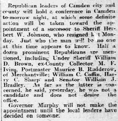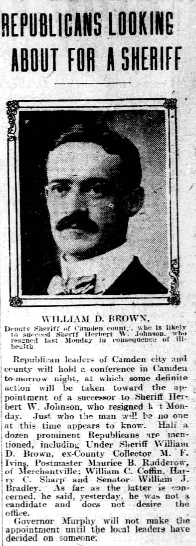 6th Street by 1880. "My dear Mrs. Bradley, It is with genuine grief that I have heard of the death of your husband. I learned in my association with him at Trenton to respect his character and judgment very deeply, and I feel that in him we have lost a man of high principle and great public usefulness. I felt that I could not deny myself this expression of admiration and deep regret. Cordially and sincerely yours, Woodrow Wilson." William J. Bradley's younger brother, Isaac V. Bradley, followed him to American Dredging and into local politics in Camden. As as a Republican in Camden's Seventh Ward, he was elected to city council four times and also served as City Clerk from 1907 to 1910. Bradley Avenue in Parkside was almost certainly named in his honor. |