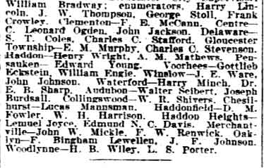 f. patterson jr. - C.V.D. Joline E. Ambler Armstrong - frank t. lloyd - f. morse archer - Robert L. Barber William J. Bradley - william d. brown - Thomas P. Curley - Charles F. Currie Isaac W. Coles - E.W. Delacroix - john j. burleigh - john cherry - William Graeff Theodore Gibbs - john s. roberts - henry j. west - george pfeiffer jr. Irving Buckle - Samuel Wood - Jonathan Watson - Maurice Redrow Richard R. Miller - Lwis H. Mohrman - David M. Anderson - G. WIlliam Harned Edward H. Chew - William Coffin - Dr. John B. Davis - dr. henry h. davis samuel s. elfreth - charles h. ellis - levi farnham - John Blowe - J. Palmer Earl Samuel P. Jones - George W. Turner - Henry M. Snyder - Lewis Stehr Sr. Charles P. Sayrs - Henry J. Rumrille - William M. Palmer - Frank Peterson Martin J. O'Brien - j. willard morgan - J. Alpheus McCracken - John R. McCabe A.G. McCausland - Joseph Kolb - John M. Kelly - E.E. Jefferies - Jacob S. Justice Robert Jaggard - Harry L. Jones - Upton S. Jefferys - William Kettler John D. Courter - dr. william s. jones - mahlon f. ivins sr. Samuel G. Hufty - Ephraim T. Gill - Francis Fithian |