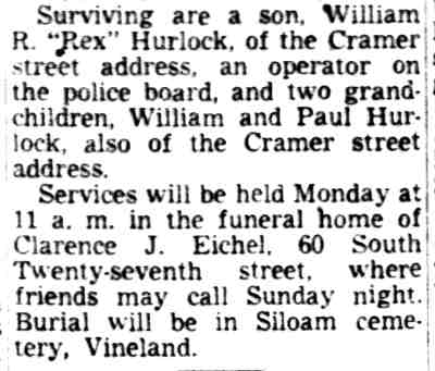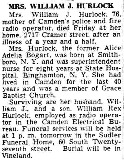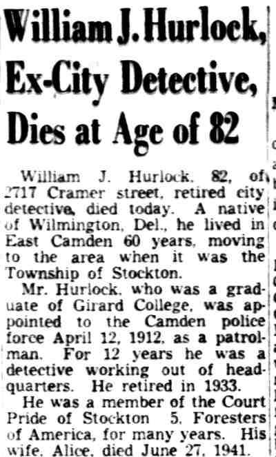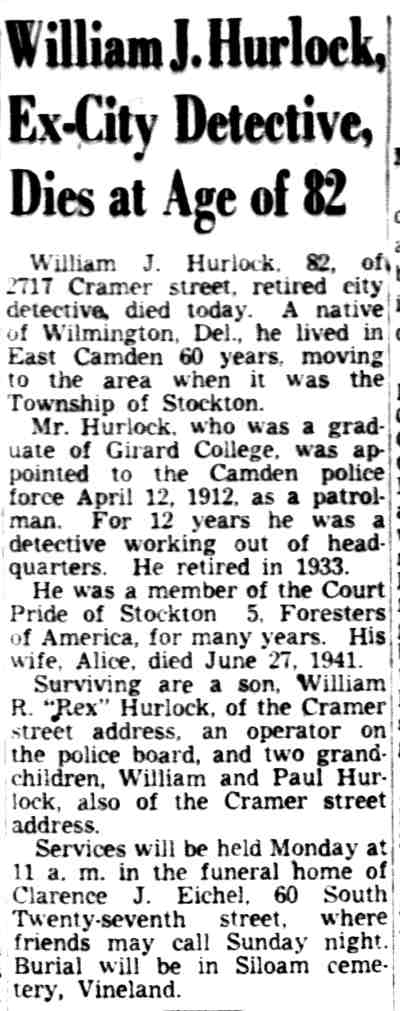 Camden. By the time the 1907 Camden City Directory was compiled, William J. Hurlock and family had moved to 2717 Cramer Street. His family maintained a presence at that address as late as 1970. Beginning in 1922 his neighbor at 123 North 28th Street was fellow Camden policeman John W. Golden. William J. Hurlock and John W. Golden would remain neighbors for the rest of their lives. The Hurlock family stayed at the Cramer Street address as late as 1970, the Goldens were still there as late as 1982. William J. Hurlock was appointed to the Camden Police Department on April 12, 1912. AFter serving as acting sergeant on a number of occasions, around 1923 he was promoted to Detective, and in the early 1920s often partnered with Louis C. Schlam. William J. Hurlock retired in 1933. A widower late in life, William J. Hurlock's wife Alice died on June 27, 1941 after an illness of an year and one-half. William J. Hurlock's last days were spent living with his son, William R. "Rex" Hurlock, a switchboard operator with the Camden Police Department, his daughter-in-law and his grandsons at 2717 Cramer Street. |