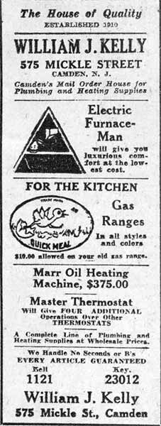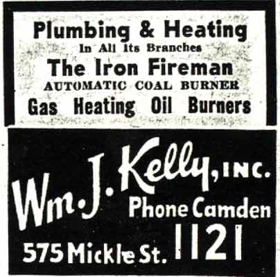 WILLIAM J. KELLY was the son of Daniel and Emma Kelly. Daniel Kelly moved to the corner of Ferry Avenue and Van Buren Street in Camden in 1881, where he operated a saloon for many years. Daniel Kelly was still living there and operating the bar as late as 1910. He retired and sold the business to John Asbert at some point prior to 1919. William J. Kelly stated a plumbing supply business in 1910. He soon became a plumbing contractor, and by the mid-1920s was one of the leading plumbing contractors in the Camden area. He was a charter director of the South Camden Trust, and served as a councilman from the Eighth Ward prior to the 1923 charter change. he also served as Republican committeeman from the Eighth. William J. Kelly was active in the fund raising drive that culminated in the building of the Walt Whitman Hotel at Broadway and cooper street. The 1920 Census shows that William Kelly was living at 675 Ferry Avenue, an address that had been in his family since 1881, and adjacent to the bar his father had operated for so many years. By 1927 William J. Kelly's had established his business at 575 Mickle Street. He and his wife had moves to 303 Third Avenue in Haddon Heights by this time. The business was still running as late as 1947, but the business does not appear in the 1956 New Jersey Bell Telephone Directory. William J. Kelly was still listed on Third Avenue in Haddon Heights in the 1959 Bell Directory. |