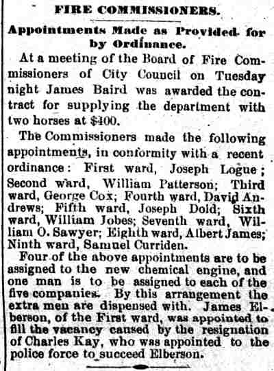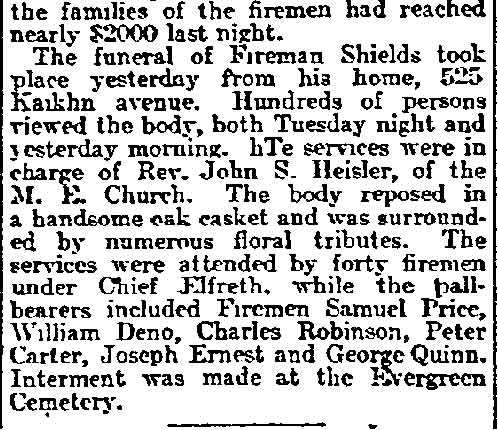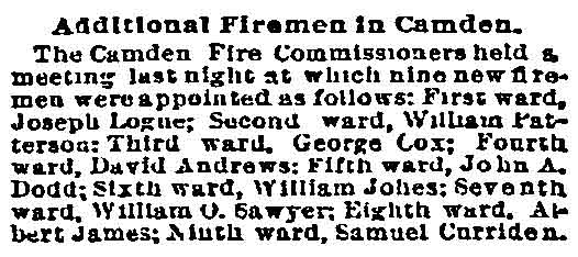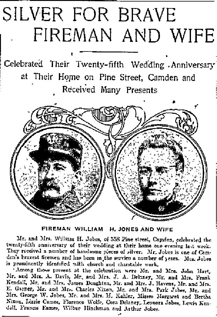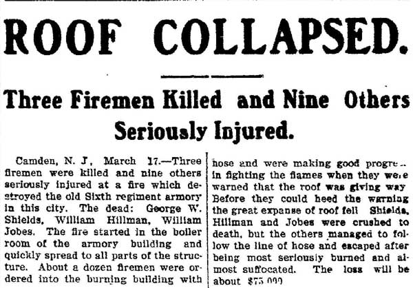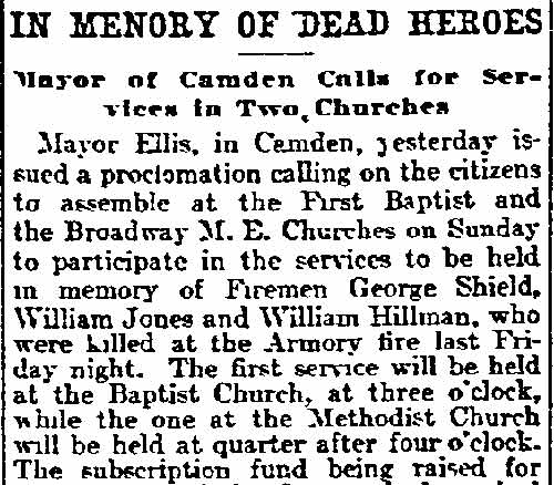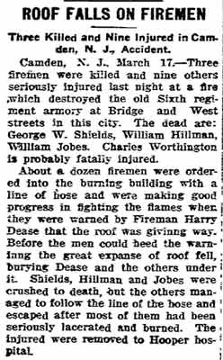 WILLIAM B. JOBES was born in March of 1857 to George W. Jobes Sr. and Elizabeth Horn Jobes. George Jobes was a tinsmith by trade, and a veteran of the Civil War. His uncle, Captain Samuel B. Jobes, had commanded Union troops at the Bliss Farm during the Battle of Gettysburg in July of 1863. The family had moved to Camden's Middle Ward by the time of the 1870 Census, where they lived with his grandmother Ann Jobes and uncle Jacob Jobes. William Jobes was the oldest child at the time of the 1870 Census, coming before sister Leonora and brothers Howard and Pancoast Jobes. The Jobes family was fairly well off, then owning a home valued at $3000. The home was most likely at 35 South Fourth Street. George Jobes and his family resided there when the 1880 Census was taken. By this time William B. Jobes had married and struck out on his own, following his father into the tinsmith's trade. Ironically, William B. Jobes would later lose his life within sight of the family home. At the age of 20 William B. Jobes married Emily McCracken, the daughter of a Scotland born carpet weaver, James McCracken and his wife Margaret. The young couple lived with her parents and brothers at 558 Pine Street in South Camden. Brother-in-law James McCracken Jr. had served as an extra man with the Camden Fire Department in 1876 and early 1877, and would serve again from 1882 into 1884. Emily bore at least two children, Leonora, born in July of 1882, and George Arthur, on August 29, 1894. James McCracken passed around 1887, survived by his widow. William and Emily Jobes remained at at 558 Pine Street through at least the summer of 1900. By the middle of 1895 William Jobes was employed by the City of Camden as a fire fighter, as a hose man assigned to Engine Company 1, which was located at 409 Pine Street . He was serving with that company on March 17, 19 06 when he, along with brother fire fighters George Shields and william hillman of Ladder Company 2, were killed in the line of duty while fighting a fire at the former Sixth Regiment Armory at 4th and Mickle Streets. Fireman Jobes was laid to rest at Harleigh Cemetery, not far from poet Walt Whitman. His widow was residing at 576 line street by the end of 1906, and remained at that address through at least 1914. Last a resident of Westmont (Haddon Township) NJ, she passed away on May 26, 1937. Daughter Leonora, also a Westmont resident, joined her parents in 1942. George Jobes became an architectural draftsman. He was living in Westmont when he registered for the draft in June of 1917. After serving in World War I, he returned to 576 line street in Camden, where he lived with his wife Serena. By 1930 he had moved to Westmont NJ. |