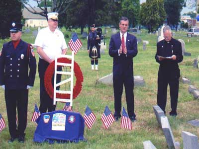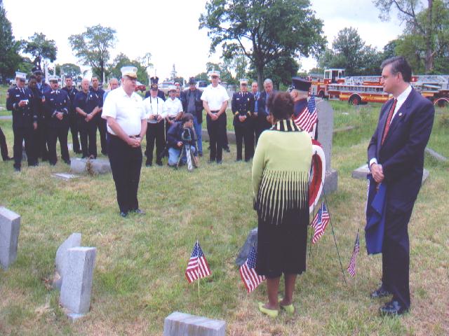 US Congressman Robert Andrews, second from the right, speaking at the dedication of the new Headstone for Camden Fireman William Hillman. Left to right in photo are, Honor Guard Camden FF David Melendez, Camden Chief of the Department Joseph Marini, in background Captain David Dilks with his Bagpipe, Congressman Robert Andrews and Msgr. Michael T. Mannion, S.T. L . |