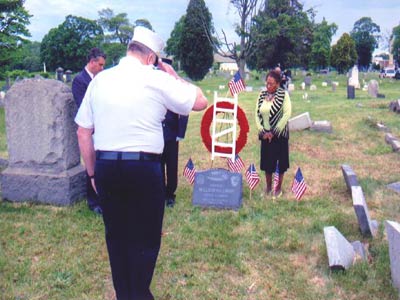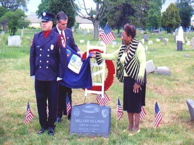 US Congressman Robert Andrews and Camden Mayor Gwendolyn A. Faison remove the cover from the headstone, as Honor Guard Camden FF David Melendez looks on.