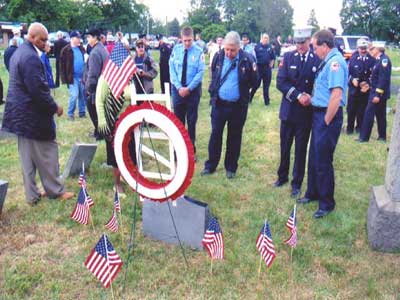 Firefighters admiring the new headstone at the gravesite of Hillman at the conclusion of the ceremonies. |