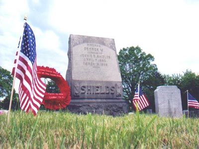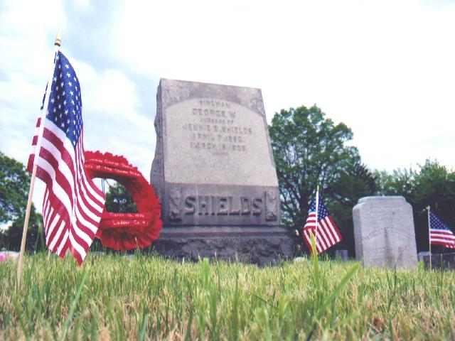 Flags and wreath at the grave site of Fireman George Shields who also died in the tragic 1906 fire. |