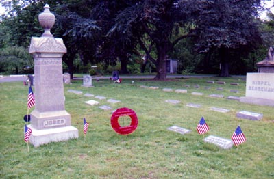 Flags and wreath at the grave site of Fireman William Jobes who also died in the tragic 1906 fire. |