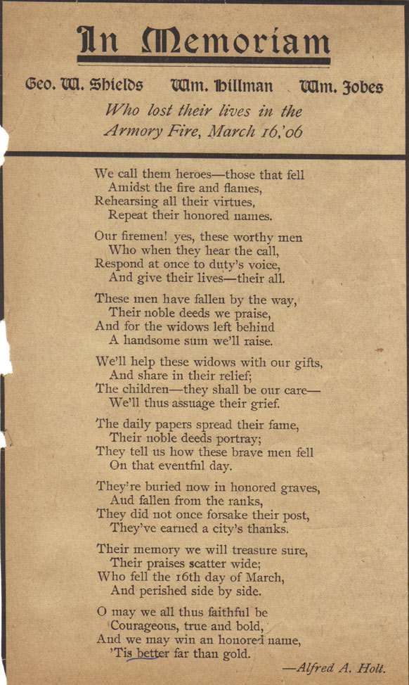 In Memorium a poem written by Alfred A. Holt in memory of Fire fighters Shields, Hillman, and Jobes |