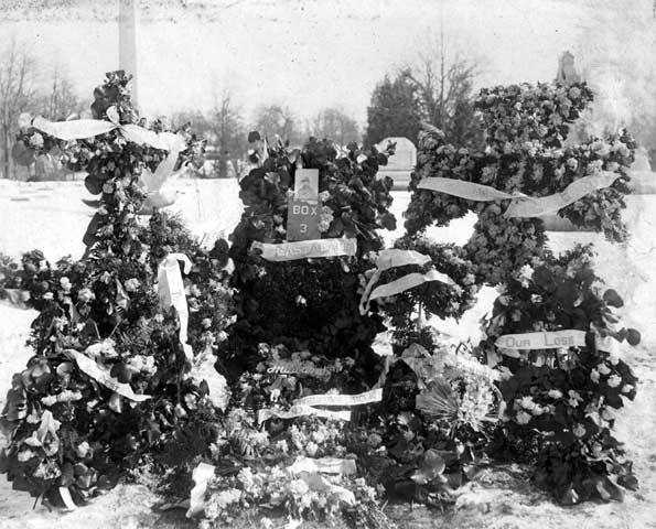 Jobes Harleigh Cemetery - Camden, New Jersey Photograph taken at burial in March 1906, showing the floral tributes presented at the funeral Click on Image to Enlarge - Click HERE to Supersize |