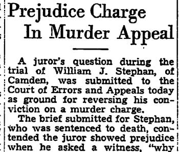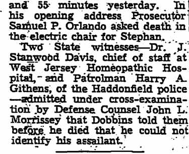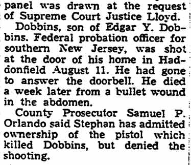 WILLIAM JOHN STEPHAN had been in and out of trouble with the law before he shot and mortally wounded Curtis Dobbins in a botched robbery of the Dobbin home in Haddonfield in 1936. He was caught, the case being investigated and prosecuted by Samuel P. Orlando. William John Stephan was executed in the electric chair at the state prison in Trenton on February 8, 1938. |