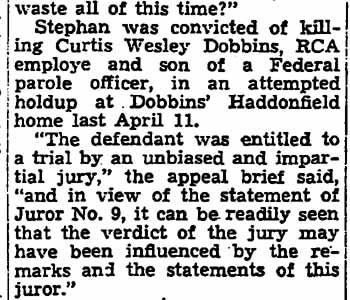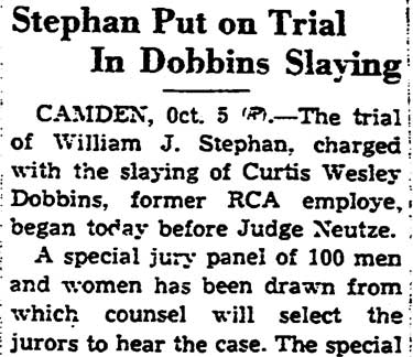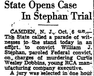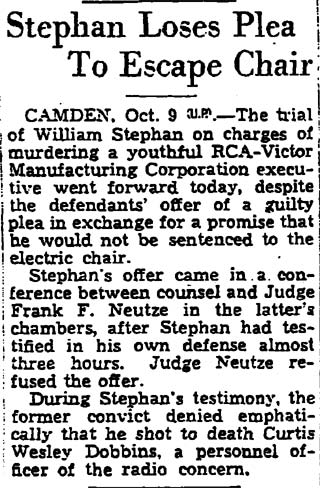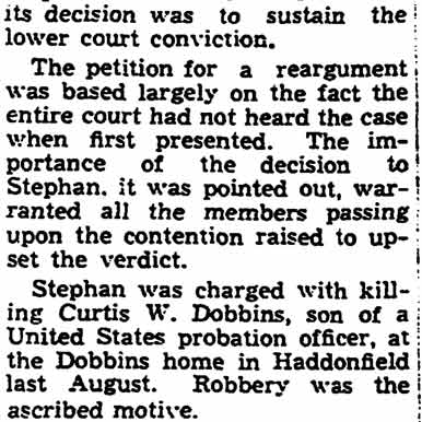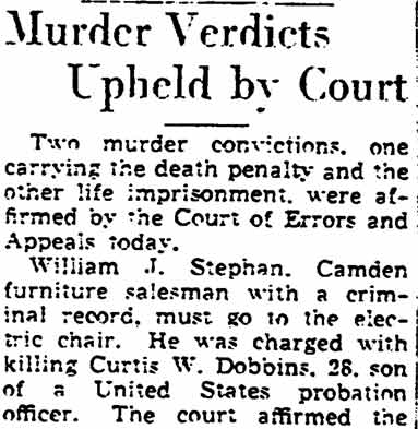 STEPHAN TO DIE IN CHAIR TUESDAY AT TRENTON William J. Stephan, convicted Camden slayer, will die in the electric chair Tuesday, at 8 p. m., for the murder of Curtis Y. Dobbins, Haddonfield athlete. Stephan, a paroled Federal prisoner, shot and killed Dobbins in the latter's home in Haddonfield on August 11. 1936. He had been serving his parole under Edgar Y. Dobbins, probation officer and father of the slain youth. The State contended that Stephan had intended to rob the son of his benefactor. Stephan was scheduled to die last November but Governor Hoffman granted him a reprieve. The Court of Pardons refused his plea for commutation of sentence to life in prison. |