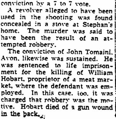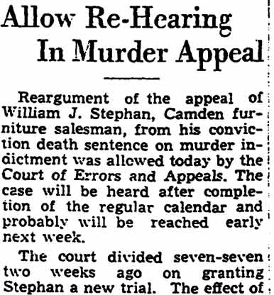 SPURNS PLEA TO SAVE STEPHAN Trenton, Feb. 7, - William J. Stephan, who is scheduled to die in the electric chair at State Prison tomorrow night for the murder of Curtis W. Dobbins, of Haddonfield, said "goodbye" to his mother last week, prison officials disclosed today. The former West Berlin salesman talked to his mother, Mrs. Madeline Hackley, for a short time. He will be permitted one more visitor before he begins "the last mile" as the 121st victim of the prison chair. It also was revealed today that E. George Aaron, Camden attorney and Stephan's counsel, made a vain appeal to Governor Moore for executive clemency. Nearly 18 months have passed since the August night in 1936 the state charges Stephan fired the shot that killed Dobbins, youthful RCA Manufacturing Company executive. Most of that time has been spent in futile appeals for life. After once rejecting Stephan's bid for a new trial by a vote of 7 to 7, the Court of Errors and Appeals later affirmed the death verdict by an 11 to 4 margin. The Court of Pardons turned down his appeal for mercy. Dobbins was the son of Edgar Y. Dobbins, Federal probation officer in New Jersey, who once had Stephan under his supervision. |