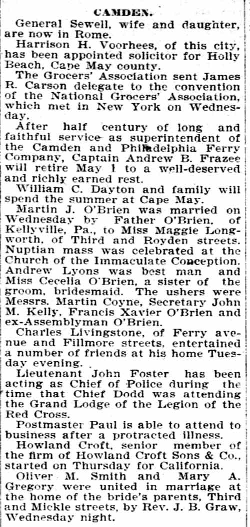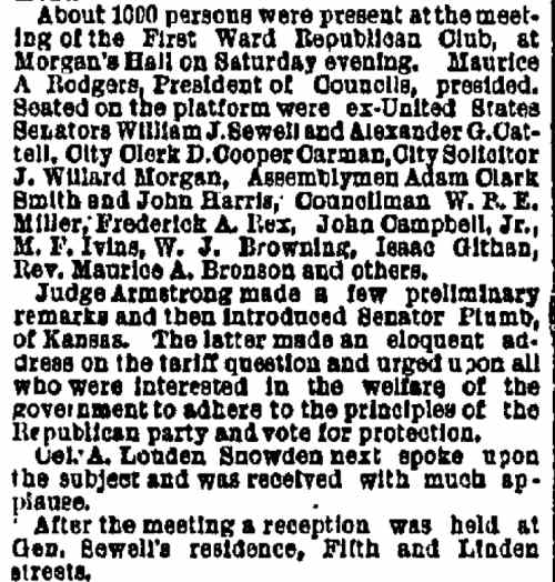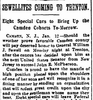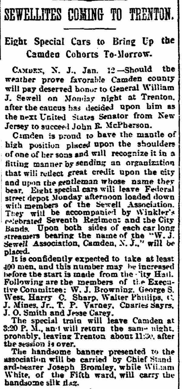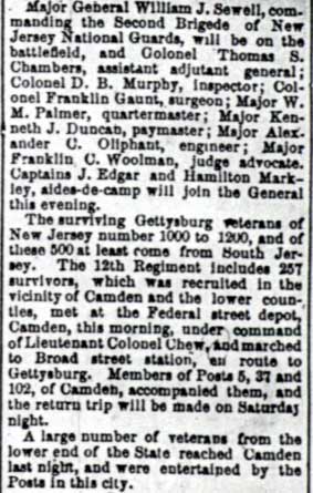 William Joyce Sewell was born on December 6, 1835 in Ireland. Orphaned at a young age, he emigrated to the United States in 1851. He was for a time employed in mercantile business in New York City, made several voyages as a sailor on merchant vessels, afterward engaged in business in Chicago IL. He moved to Camden NJ in 1860. When the Civil War started, William Joyce Sewell raised a company of Volunteers, and was commissioned Captain and commander of Company C, 5th New Jersey Volunteer Infantry. He fought with his regiment in the Peninsular Campaign and at the Second Battle of Bull Run, and had been promoted to Lieutenant Colonel in July 1862. When the 5th New Jersey’s commander, Colonel Samuel H. Starr, was recalled in October 1862 from volunteer service back to the Regular Army, William Sewell became commander of the regiment and was promoted Colonel in January 1863 (on the recommendation of Colonel Starr himself). Colonel Sewell led the unit at the May 1863 Battle of Chancellorsville, where he would render his most distinguished service of the War. In the heavy fight along the Plank Road, the 5th New Jersey’s brigade commander, Brig. General Gershom Mott, was severely wounded and had to leave the field. His brigade and other elements started to retreat, but Colonel Sewell, now in command of the brigade, rallied them around the brigade colors and successfully led a counterattack. Although wounded himself, he held his position, fending off several more attacks before his unsupported troops, out of ammunition, had to retreat. His bravery in rallying his men would win him the Congressional Medal of Honor 33 years later. William Joyce Sewell would recover sufficiently from his wounds to be in command of the 5th New Jersey during the Gettysburg Campaign. On the second day of that great Battle, July 2, 1863 his unit was at first posted in the Trostle Woods with the rest of his brigade. When it became apparent that the Army of the Potomac’s III Corps line, dangerously extended to the Emmitsburg Road, needed re-enforcement, Colonel Sewell’s regiment was detached and sent to Emmitsburg Road in between the Rogers and Klingel Farm Houses. Late in the afternoon the regiment absorbed the first attacks by Confederate General Cadmus Wilcox's brigade, holding their position until driven back, and stopping to support Lieutenant Francis W. Seeley's Battery K, 4th United States Regular Artillery in front of the Klingel House. Here Colonel Sewell’s command took a great pounding from Confederate counter-battery fire, as well as pressure from Rebel troops to their front and left. Finally the 5th NJ was ordered to withdraw, and Colonel Sewell was again severely wounded. William Joyce Sewell would not be able to rejoin his regiment for some time afterwards, but was sufficiently recovered to lead the unit during the Wilderness campaign. In that last battle fatigue and his wounds got the better of him, and he left the regiment, eventually resigning in July 1864 due to his ill health. Two months later his services were again called upon, and he was appointed as Colonel and commander of the newly raised 38th New Jersey Volunteer Infantry. He commanded his new unit, which mostly saw only garrison duty along the James River, until its muster out in July 1865. On March 13, 1865 he was brevetted Brigadier General, US Volunteers for “gallant and meritorious services at the Battle of Chancellorsville, Va.” and Major General, US Volunteers for “gallant and meritorious services during the war”. After the war William Joyce Sewell returned to Camden, where he would make his home for the rest of his days. He built a large home at 500 Linden Streets, which was converted into a private hospital after he passed away. William Joyce Sewell became a powerful railroad executive and a power broker within New Jersey state politics. He was vice-president of the West Jersey Railroad, and held interest in the Camden and Amboy Railroad Company and the Camden and Atlantic Railroad Companies. He was a director of the Camden & Philadelphia Steamship Ferry Company, the Camden Safe Deposit & Trust Company, and the West Jersey Mutual Insurance Company. He also servced as president of the West Jersey Ferry corporation. In 1889, a syndicate composed Sewell, Edward Ambler Armstrong, and real estate promoters Edward C. Knight and Edward N. Cohn, purchased the Camden Horse Railroad Company and converted the entire line to electricity. A year later, they extended the electric trolley line along Federal Street to Wrightsville, providing a major step towards the development of the agricultural area of Stockton Township, which is present day east camden. with samuel h. french he was an officer of the Stockton Rifle Range, which evolved into the ninety acre Stockton Park. William Joyce Sewell developed neighborhoods in Camden, Cape May, and Gloucester counties- the Sewell section of Washington Township bearing his name. He was the dominant figure politically in Camden, his protege, David Baird Sr., taking care of things locally while Sewell was in Trenton and Washington. William Joyce Sewell served in the New Jersey State Senate from 1872 to 1880, being its President from 1876 to 1880. In 1881 William Joyce Sewell was elected as a Senator from New Jersey in the United States Senate, serving from 1881 to 1887. During his first term as a senator chairman, he sat on the Committee on Enrolled Bills (Forty-seventh and Forty-eighth Congresses), Committee on Military Affairs (Forty-ninth Congress), Committee on the Library (Forty-ninth Congress). He was defeated in his re-election bid in 1887, and in subsequent bids in 1889 and 1893. During his time out of office he remained in public life as one of the national commissioners for New Jersey to the World’s Columbian Exposition in Chicago in 1893. He was in command of the Second Brigade of the National Guard of New Jersey, and was appointed a member of the Board of Managers of the National H