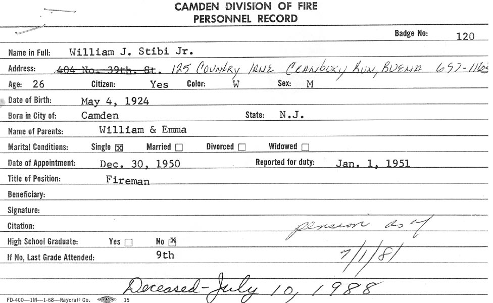 Street Edward V. Michalak George P. Baxter Thomas Carter Ratcliffe Randy Smith Robert Smith Emilene Green Edward sharp Philip Bocelli James Snyder James Green Shirley Ratcliffe George Pugh Emma Lou Ratcliffe Patricia Smith William Roane Benjamin Walters William Kamman William Stibi Jr. John Dimaggio James T. McGrory Ladder Company 2 Rescue Company 1 Engine Company 3