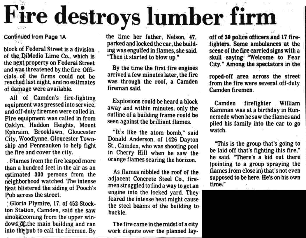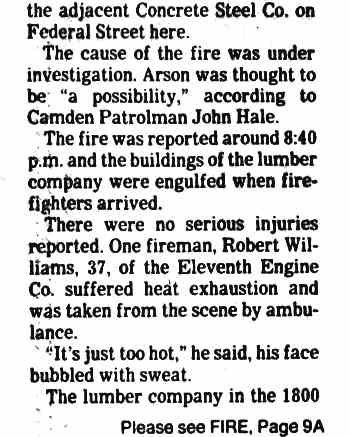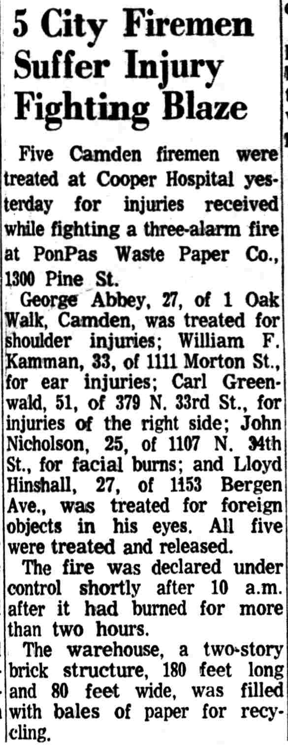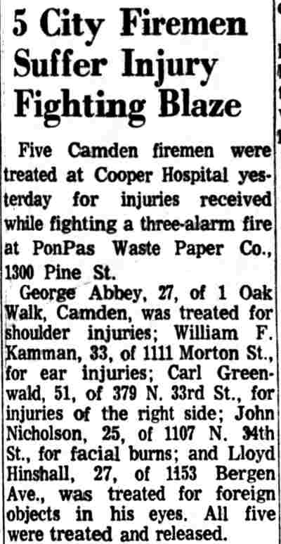 WILLIAM L. KAMMAN was born on August 26, 1938 to William and Bertha Kamman. The 1940 City Directory shows the family, which included siblings Alice, Richard, and Wayne, living at 1254 Thurman Street. By 1943 they had moved to 1091 Thurman Street and they remained at that address through at least the fall of 1959. William Kamman joined the Camden Fire department on August 15, 1961. He married not long afterwards, his wife Patricia bearing one child, a son, also named William. The Kamman family lived at 1111 Morton Street through at least 1970. William L. Kamman was promoted to Captain on February 1, 1989. He on January 1, 1994 after over 32 years with the Camden Fire Department. His last years were spent in Florida, where he died on May 18, 2007. |
