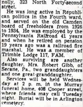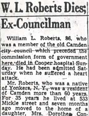 WILLIAM L. ROBERTS was born in Yonkers NY around 1863. He came to Camden in the 1880s, and by 1887 he was working as a carpenter for the Camden & Atlantic Railroad. At that time he lived at 12 York Street. He married around 1890. His later years of work for the railroad were as a Fire Marshall, and he remained with the railroad, which was absorbed by the Pennsylvania Railroad. William L. Roberts bought a home at 533 Mickle Street, near the corner of Mickle Street and Broadway, around 1914. William L. Roberts was still living at 533 Mickle Street in 1930. Then widowed, his housekeeper, a widow, Anna Emery, 65, lived on premises.He retired shortly after the April 1930 Census. Active in Republican politics, he served on the Camden County Board of Freeholders from Camden's 4th Ward from 1926 until 1934. After finally moving from his home on Mickle Street in the summer of 1949, William L. Roberts passed away in February of 1950. A member of Trimble Lodge, No. 117 Free and Accepted Masons, he was buried at Arlington Cemetery in Pennsauken NJ, after services at the Murray Funeral Home at 408 Cooper Street in Camden.. |