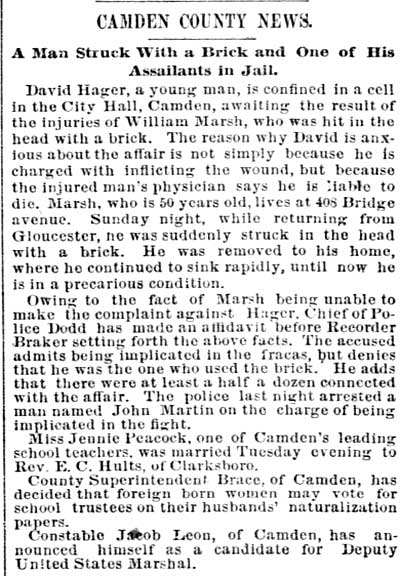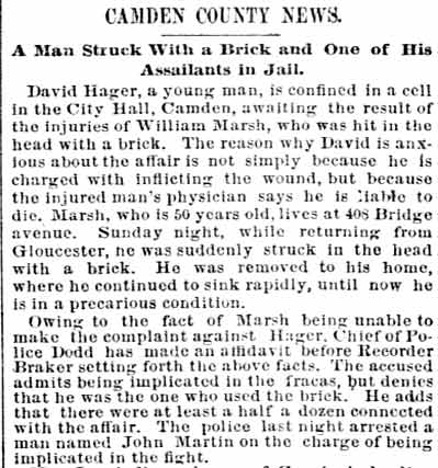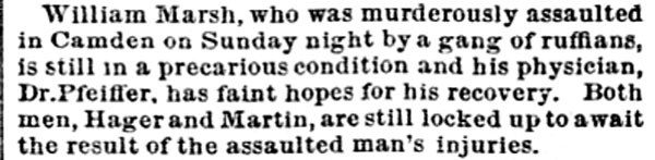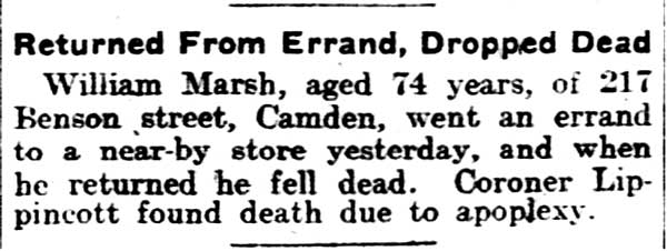 William P. Marsh was born in Pennsylvania around February of 1839. Little else is known about his early years, save that he was not in Camden when the Census was taken in 1860. In August of 1862 William Marsh enlisted in the United States Navy. He served aboard the the USS Powhatan for four months, and was discharged in December of 1862. The USS Powhatan was a sidewheel steam frigate, named for Powhatan, a Native American chief of eastern Virginia. She was one of the last, and largest, of the United States Navy's paddle frigates. Powhatan's keel was laid on August 6 1847 at Norfolk, Virginia. Her engines were constructed by Mehaffy & Company of Gosport, Virginia. She cost $785,000. She was launched on February 14, 1850 by the Norfolk Navy Yard and commissioned on September 2, 1852, Captain William Mervine in command. Powhatan, under Comdr. William J. McCluney, was next assigned to the East India Squadron and arrived on station via Cape of Good Hope on June 15, 1853. Her arrival in Chinese waters coincided with an important phase of Commodore Matthew C. Perry's negotiations for commercial relations with the Japanese and the opening of two ports. She was Perry's flagship during his November visit to Whampoa. On February 14, 1854 she entered Yedo (Tokyo) Bay with the rest of the squadron and the Convention of Kanagawa was signed on March 31, 1854. During August 1855 Powhatan accompanied HMS Rattler in a successful battle against Chinese pirates off Kowloon, and reached the U.S. on February 14, 1856 with the new treaty. The US-Japan Treaty of Amity and Commerce was signed on her deck on July 19, 1858. On February 13, 1860, the Powhatan accompanied by a Japanese capital ship, Kanrin Maru that departed on February 9, left Yokohama, Japan, en route to San Francisco as part of the first official embassy of the Empire of Japan to the United States of America. Powhatan remained active throughout the Civil War. She served as Flag Officer Garrett J. Pendergrast's flagship at Vera Cruz during October 1860. In April 1861, while under the command of Lt. David Dixon Porter, she assisted in the relief of Fort Pickens, Florida, and in the establishment of the blockade of Mobile, Alabama on May 26, capturing schooner Mary Clinton on May 29. During July and August Powhatan joined the blockade of the Southwest Pass of the Mississippi River, retaking schooner Abby Bradford on August 15. From late August to October she pursued CSS Sumter throughout much of the West Indies. William P. Marsh was served aboard Powhatan when she operated off Charleston, South Carolina from October 1862 to December of 1862. While serving aboard the USS Powhatan, one of his shipmates was Landsman Barton Lane. Both men would later serve as members of the Camden Fire Department. Shortly after leaving the Navy William P. Marsh got married. When the 1870 Census was taken, William P. Marsh lived in Camden's South Ward with his wife Sarah, daughter Phoebe and son George W. Marsh. The Marshes had nine children altogether, sadly, by 1900 only Phoebe and George were still alive. William P. Marsh began working as a railroad car inspector for the West Jersey Railroad, a profession he would follow for quite some time. He did the same work in later years for the Pennsylvania Railroad. As stated above, William P. Marsh was appointed to the Camden Fire Department on April 8, 1876 as an extra man with Engine Company 1. The Marsh family was living at 827 South 5th Street, a short walk from the Engine Company 1 firehouse at 409 Pine Street. They stayed at 827 South 5th Street into 1878, then moved across the street to 840 South 5th Street. By the spring of 1880 they had moved once again, to 831 South 5th Street. Here they stayed through 1885. As stated above, on April 5, 1882 William P. Marsh was reappointed to the Camden Fire Department as an extra man with Engine Company 2. He served in this capacity for two years. The 1887-1888 and 1888-1889 City Directories show William Marsh and family at at 653 South 3rd Street. By April of 1889 they had moved to 408 Bridge Avenue. By mid-1894 William Marsh had moved to 217 Benson Street, where he would live until 1896. The 1897 City Directory places him at 223 Benson Street. Both the 1898 and 1899 City Directories state that he was living with his daughter Phoebe at the corner of Fillmore Street and Ferry Avenue. Daughter Phoebe Marsh is listed in the City Directories in the late 1890s as a artist and as a photographer. In 1896 and 1897 she was living at 223 Benson Street, and had a photography studio at the corner of Newton and Haddon Avenues in 1896 and at South 8th and Spruce Streets in 1897. In 1898 her studio was at the corner of South 6th and Mickle Streets, and in 1899 she was in business at the 272 Kaighn Avenue. When the Census was taken on June 2, 1900 William Marsh, his wife Sarah, and daughter Phoebe were living once again at 217 Benson Street. According to the Census, William Marsh was not working, nor was Phoebe. William P. Marsh died from a stroke on August 19, 1903. His widow and daughter were still living at 217 Benson Street in 1906, Phoebe Marsh by the having set up another studio, this time at 1434 Broadway. |
