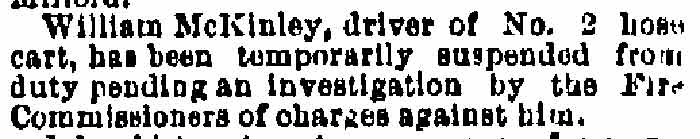 Through the 1880s Isaac and William McKinley's movements are as follows. The 1881-1882 Directory show them at the same addresses as in the 1880 census, William McKinley now is an "engineer". The 1883-1884 Directory shows Isaac at the same address, but now working as a car inspector for the West Jersey Railroad. William McKinley had moved to 314 South 2nd Street, is now a driller for the Pennsylvania Railroad. The 1884-1885 shows Isaac McKinley doing the same work and at the same address. William McKinley was appointed stoker for the Camden Fire Department under Chief Daniel A. Carter in the spring of 1884. He was again let go after one year when Samuel S. Elfreth is re-elected Chief.