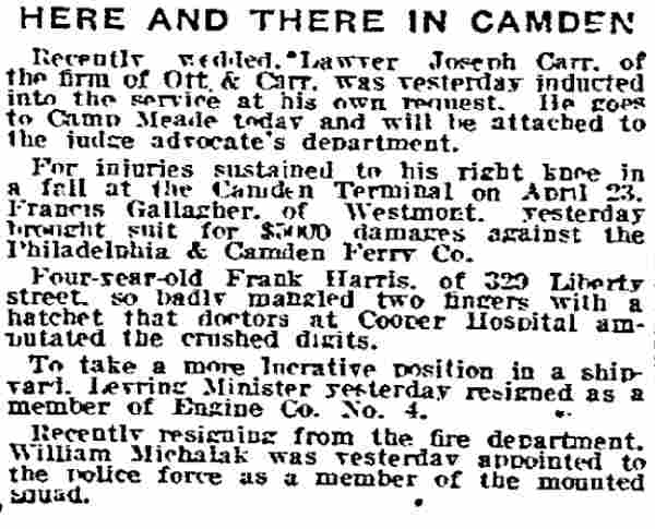 Charles Humes South 2 4th Street - North 25th Street - North 4th Street - Penn Street - Fiore Troncone - Chestnut Street Sheltering Arms Home - Newton Ash - William Michalak - John J. Robinson - Roy R. Stewart |