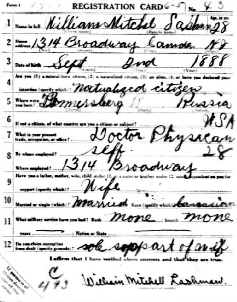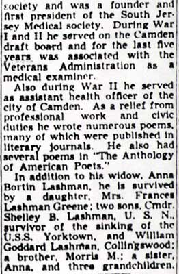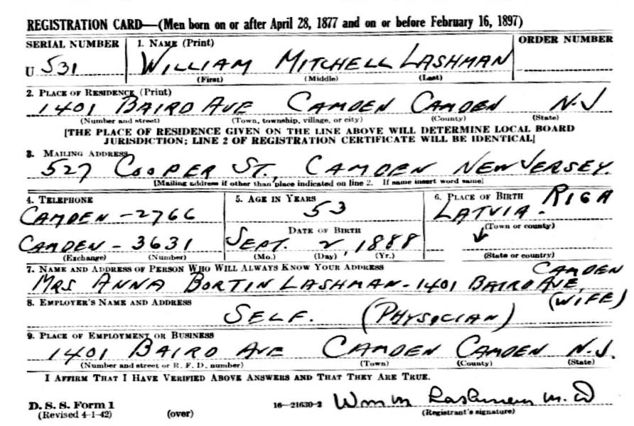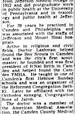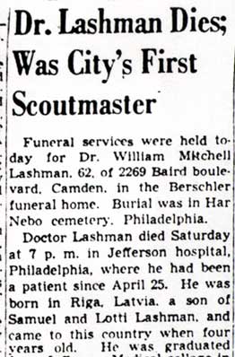 Dr. William Mitchell Lashman was born in Riga, Latvia, then part of the Russian Empire, in 1888 to Samuel and Lotti Lashman. Coming to America with his family at the age of 4, he graduated from Central High School in Philadelphia in 1906 and from Jefferson Medical College in 1912. He interned at Chester Hospital in Chester, Pennsylvania in 1913 and was subsequently appointed to Camden General Hospital. The 1914 Camden City Directory shows Dr. Lashman living with his parents and sisters at 512 Broadway. Dr. Lashman did post-graduate works at the University of Pennsylvania and at the Woman's Medical College in 1918 and 1919. He practiced in Camden and Philadelphia for 39 years, specializing in Internal Medicine and Industrial Medicine. He served as the Camden's Assistant Director of the city's Department of Health from 1943 to 1946, and was a member of the Camden City Medical Association and the Camden County Medical Association. Dr. Lashman's offices in the late 1930s were at 1308 Broadway and also had offices at 527 Cooper Street. Dr. Lashman was active in religious and civic affairs in Camden. He helped found the Boy Scouts in Camden and was the city's first scoutmaster, and he founded and was first president of the B'nai Brith chapter in Camden. He was also a founder and first president of the South Jersey Medical Society. He also was a published poet. He had lived in Parkside at 1404 Baird Avenue in the 1920s and 1930s. By 1947 he had moved to 1401 Baird Avenue. He last made his home at 2269 Baird Boulevard in East Camden. Dr. Lashman passed away on July 21, 1951. He was survived by his wife, Anna Bortin Lashman, a daughter, Frances Lashman Greene, and two sons, William Goddard Lashman and Commander Shelley Bortin Lashman USN, a survivor of the sinking of the USS Yorktown during WWII and a noted lawyer and jurist for many years, who was still active as a Workmen's Compensation judge as late as October 2002. |